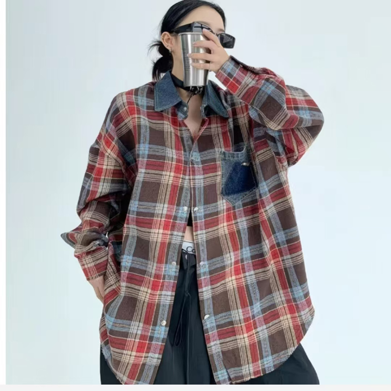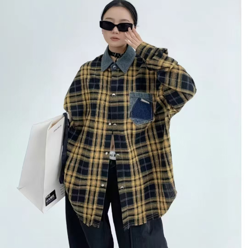 YF7009-(2色)港式牛仔POLO领拼接格子胖MM显瘦大码多巴胺复古慵懒风衬衫