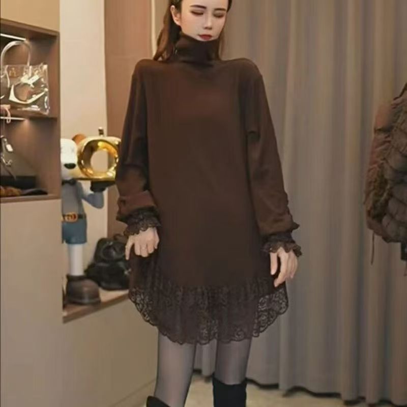 YF7015-(3色入内)春秋时尚胖MM显瘦A字蕾丝拼接高领长袖中长款别致上衣