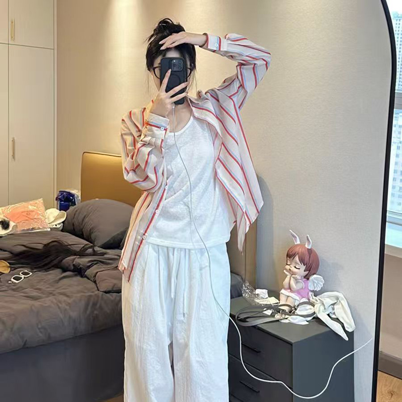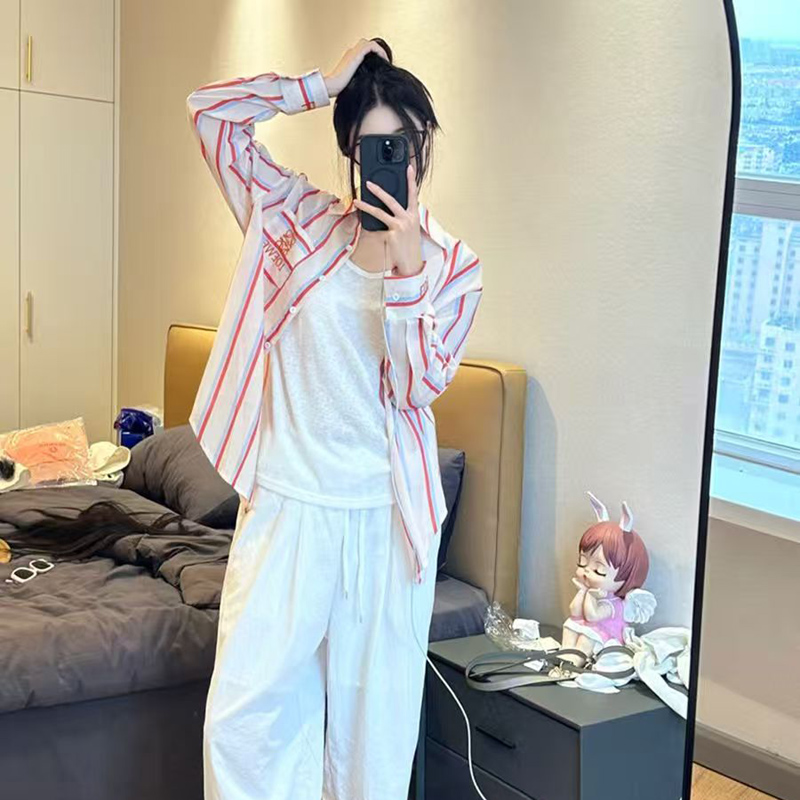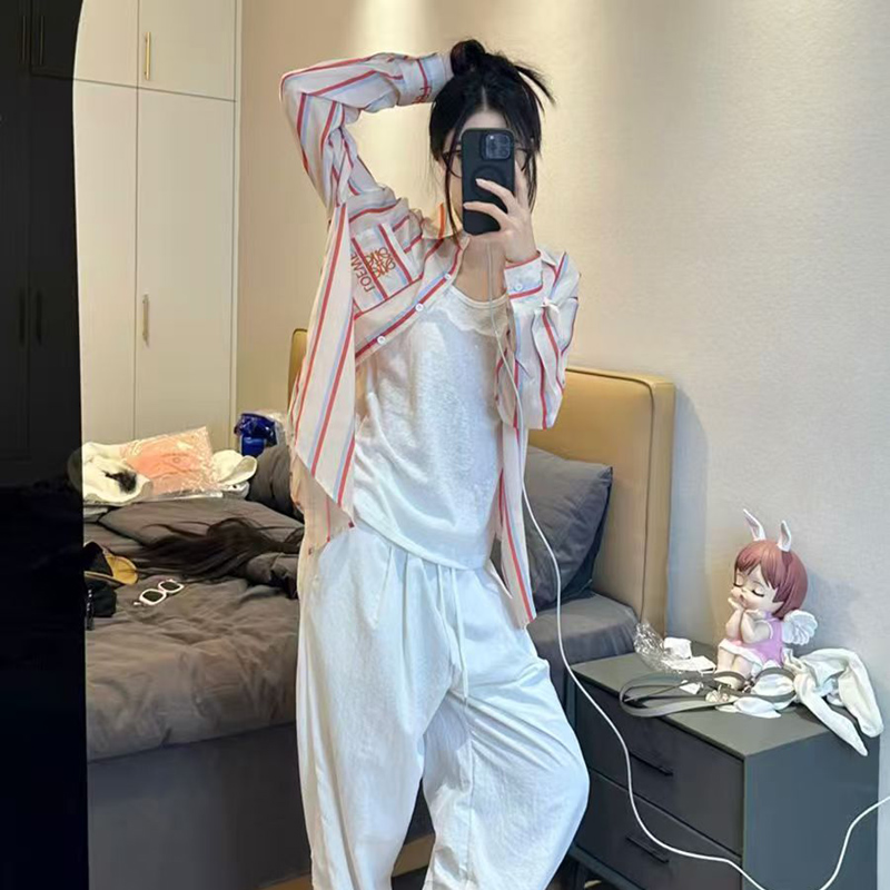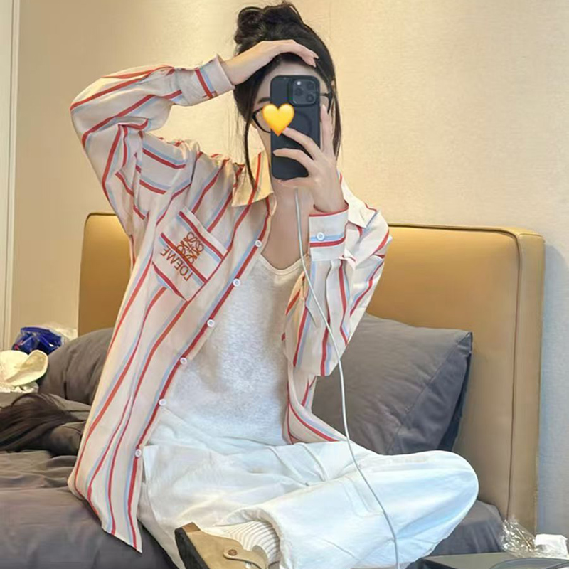 YF7030-图片色港式春装字母刺绣坚条纹长袖翻领宽松显瘦休闲百搭衬衣