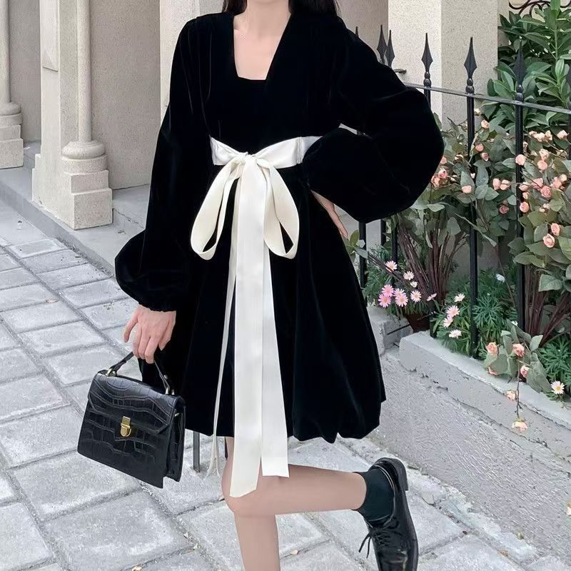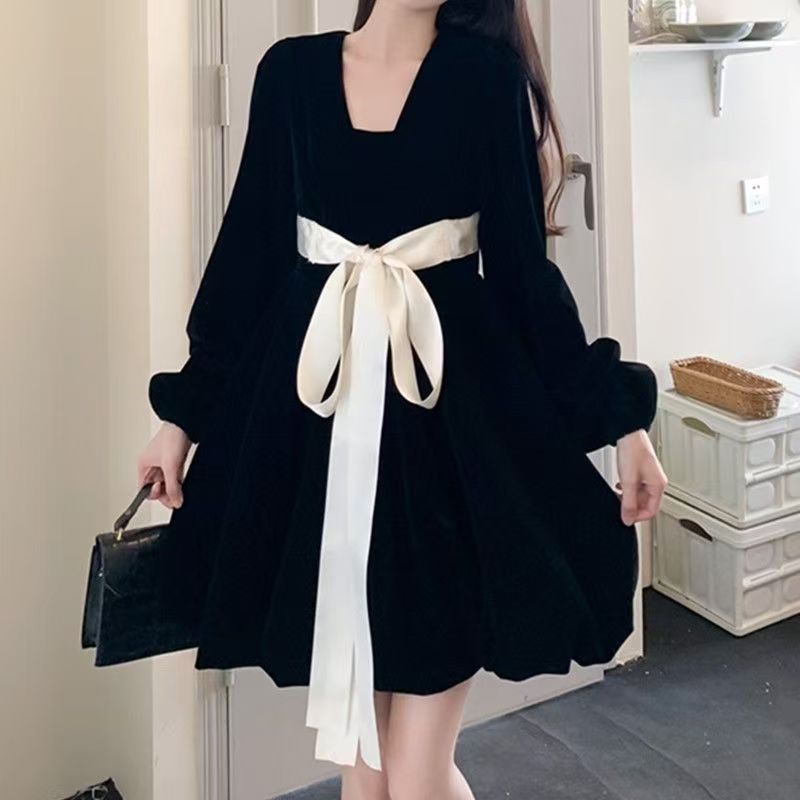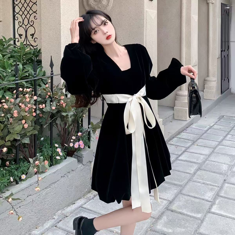 YF7034-图片色赫本风春秋时尚灯茏袖套头撞色蝴蝶结收腰显瘦丝绒高级感连衣裙