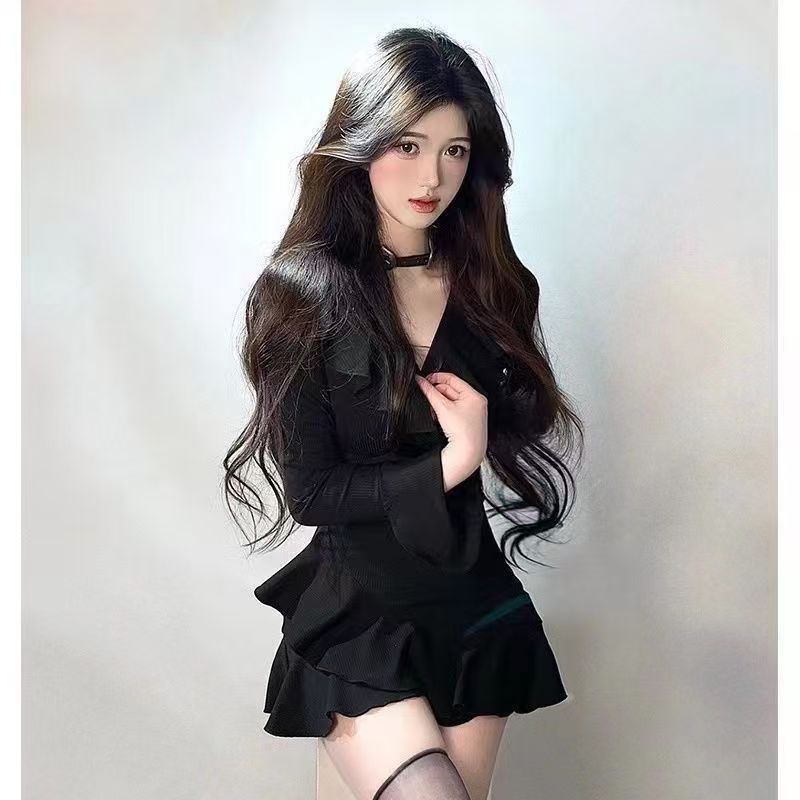 YF7035-图片色甜美春秋百搭长袖V领荷叶边修腰法式复古气质修身包臀连衣裙