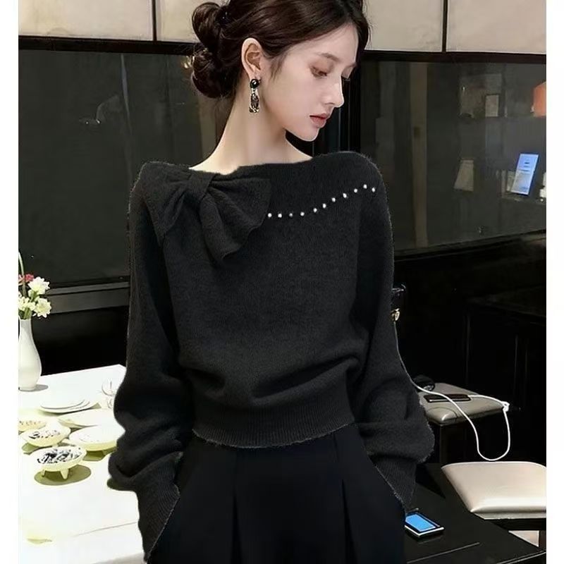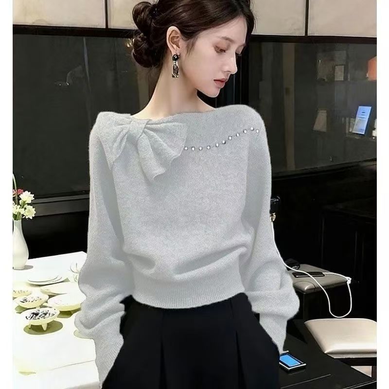 YF7040-(2色入内)甜美秋冬侧系蝴蝶结烫钻名媛感圆领长袖宽松针织毛衣