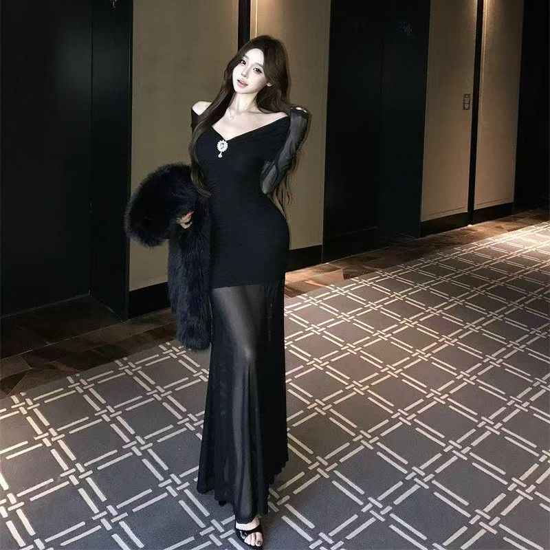 YF7042-(3色入内)名媛气质一字肩披肩感褶折钉珠弹力修腰包臀鱼尾网纱设计连衣裙