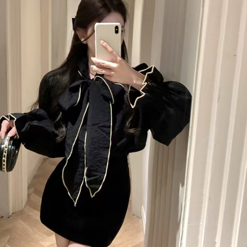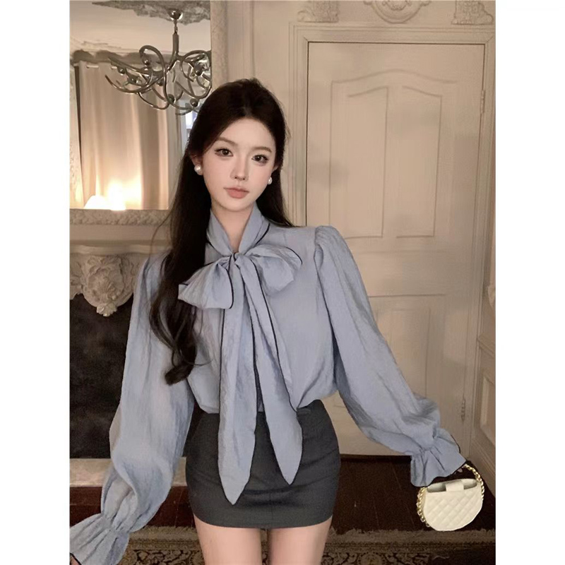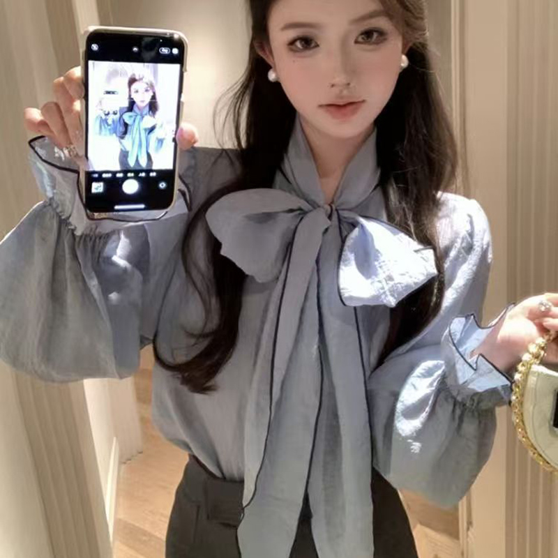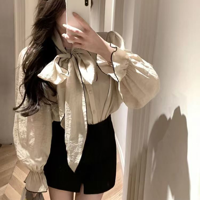 YF7054-(3色入内)复古气质泡泡袖系蝴蝶结拼色设计宽松大码显瘦韩版衬衣