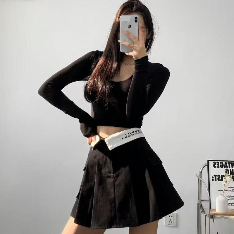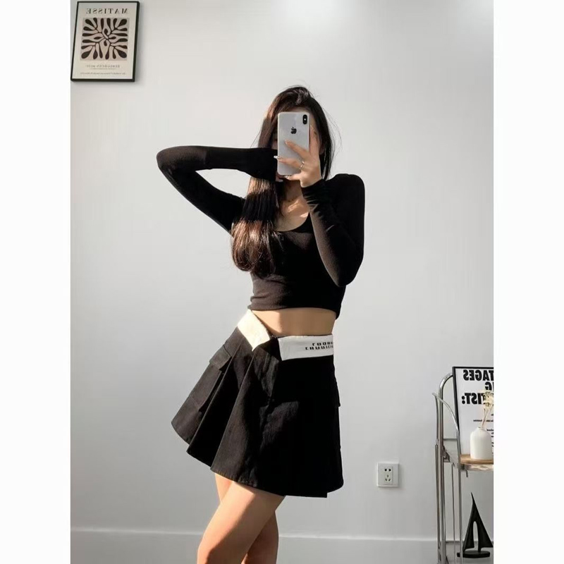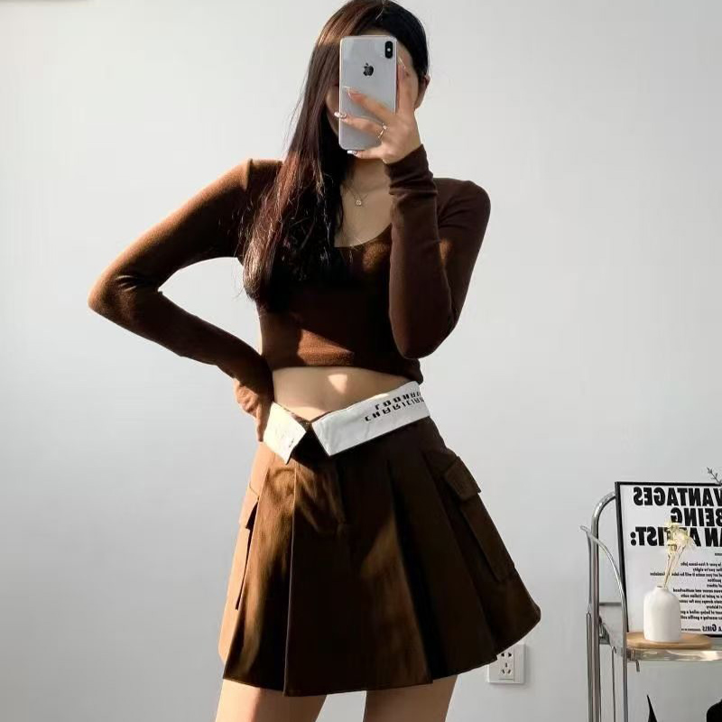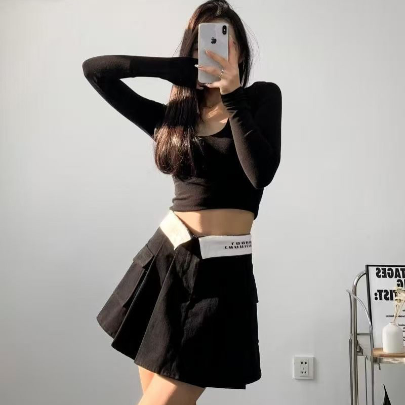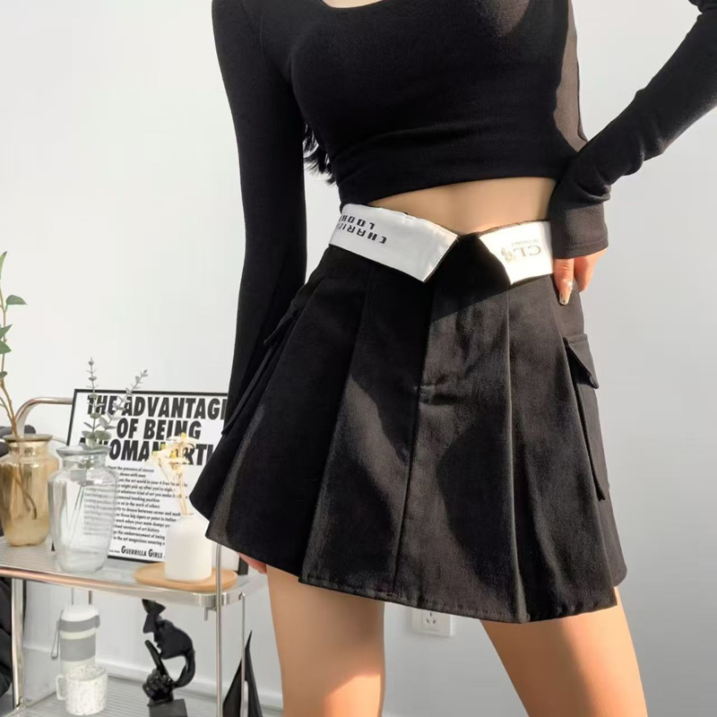 YF7056-图片色时尚日系撞色不规则印花褶折A字阔腿工装设计原宿风短裙
