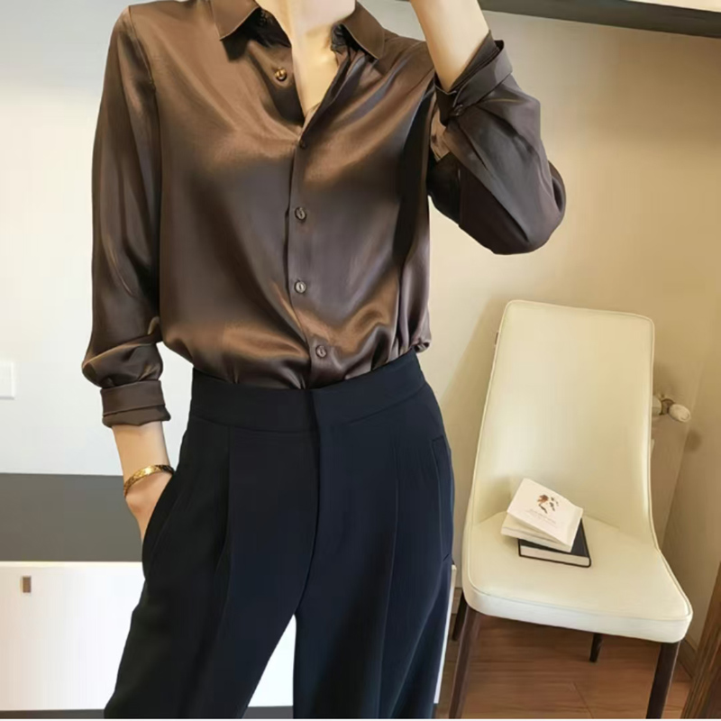 YF7058-(3色入内)韩版春秋新款长袖翻领宽松显瘦丝质感别致大码显瘦OL通勤上衣