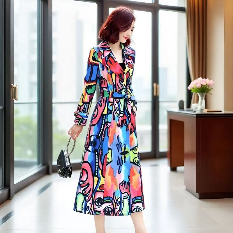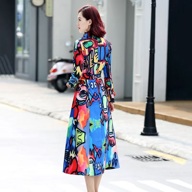 YF7060-图片色欧美不规则扎染印花系漫画设计长袖V领收腰过膝长款连衣裙