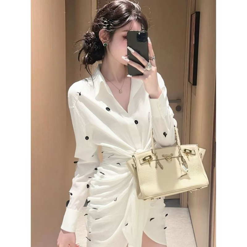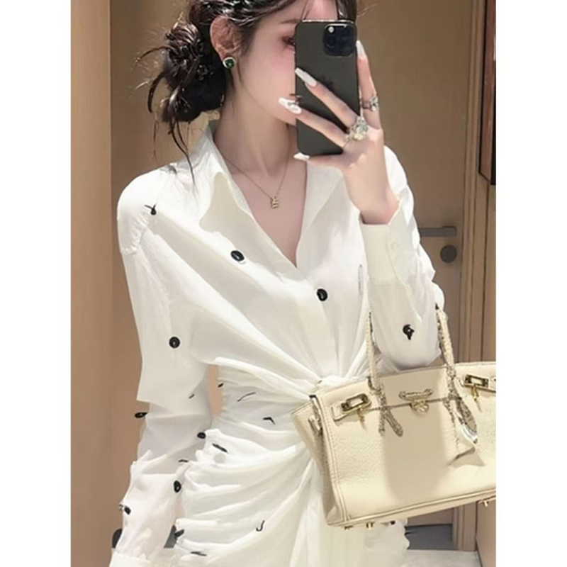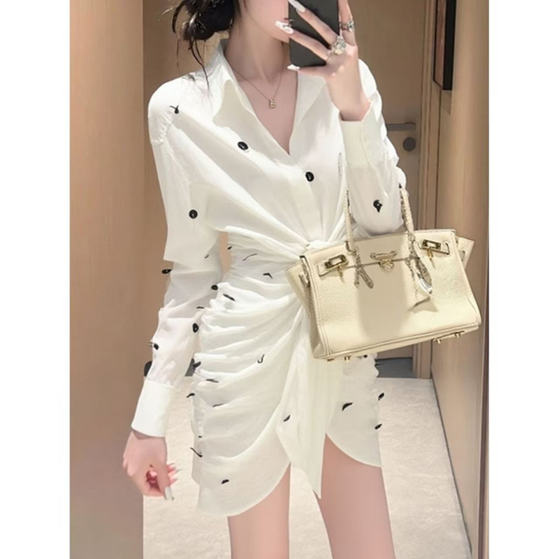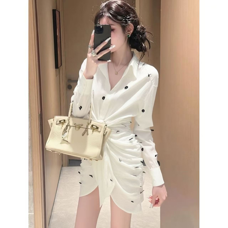 YF7061-图片色韩版白色波点POLO领系腰带褶折弧边别致小众辣妹新款连衣裙