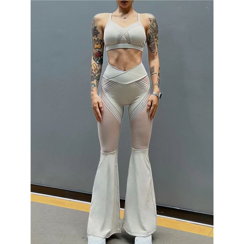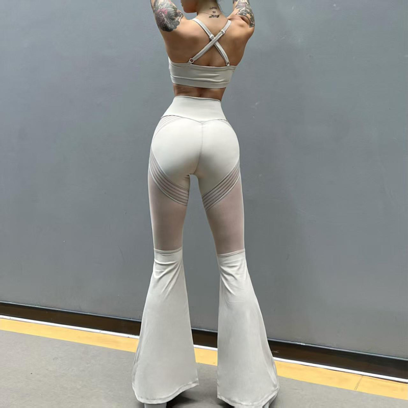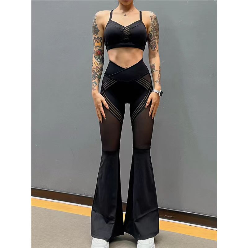 YF7062-(3色入内)性感辣妹网纱拼接交叉收腰弹力包臀微喇叭坠地感蕾丝裤