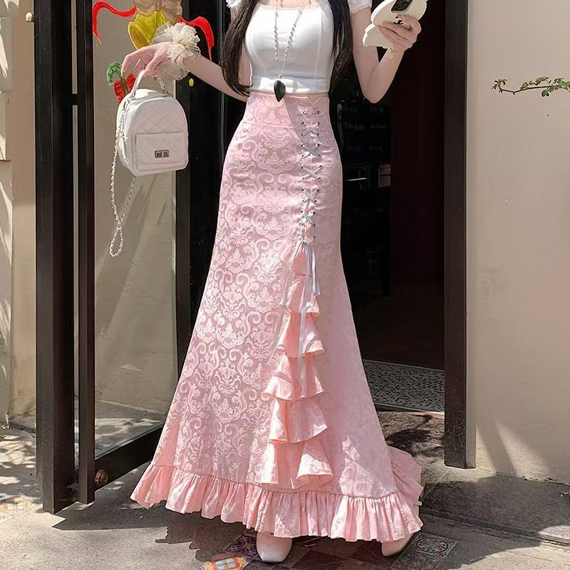 YF7063-(3色入内)古典复古风收腹高腰绑绳荷叶边A字鱼尾蕾丝束腰宫廷式半身裙