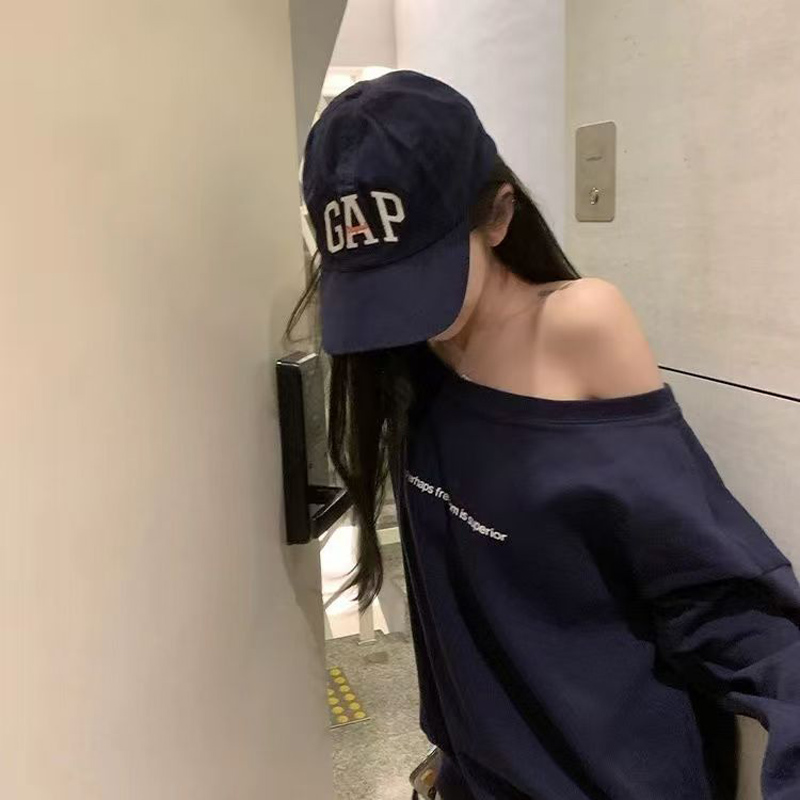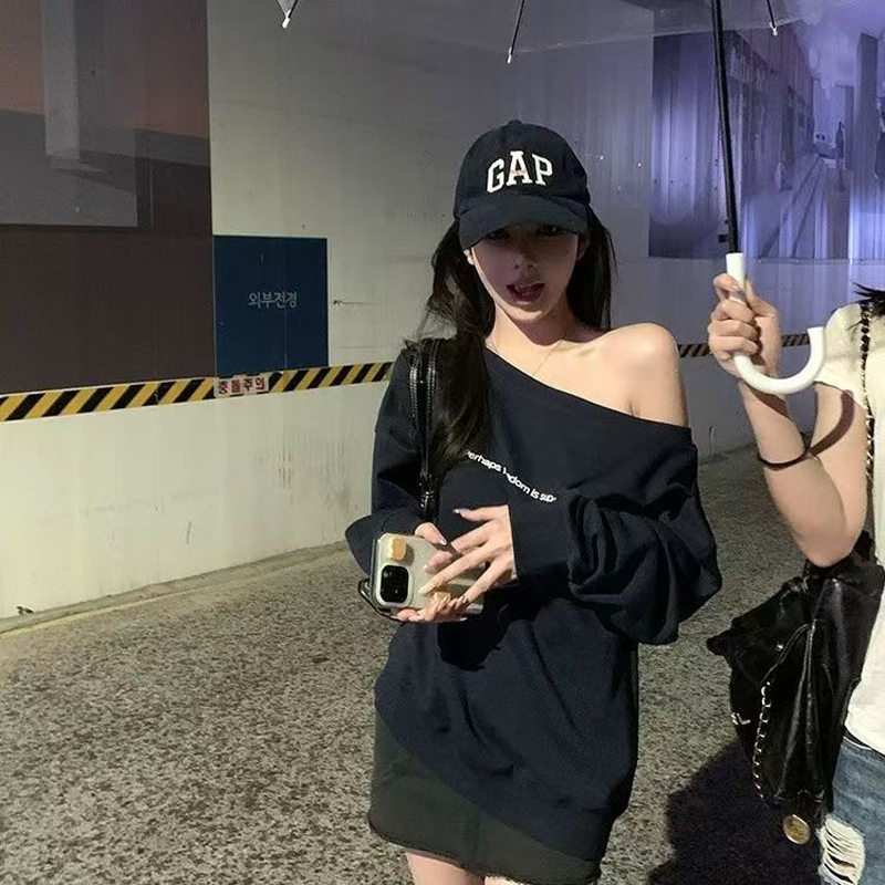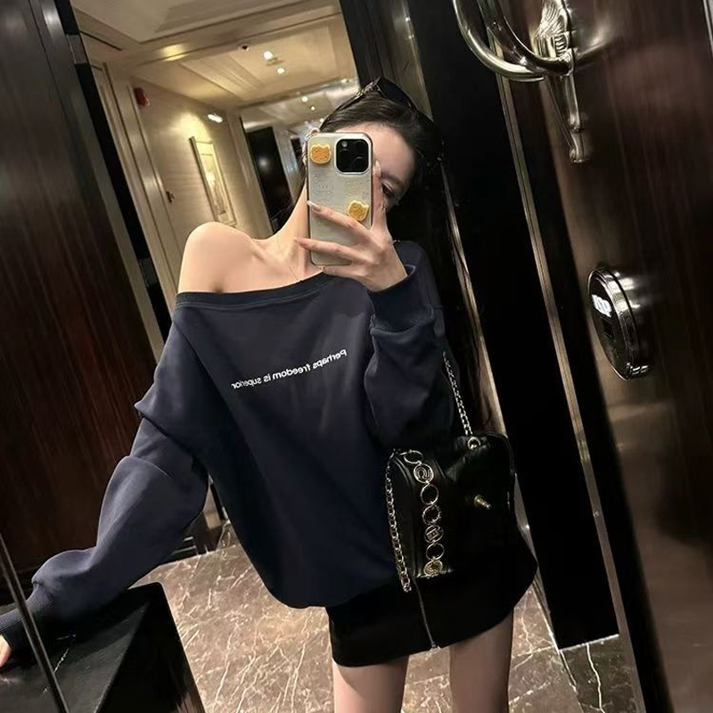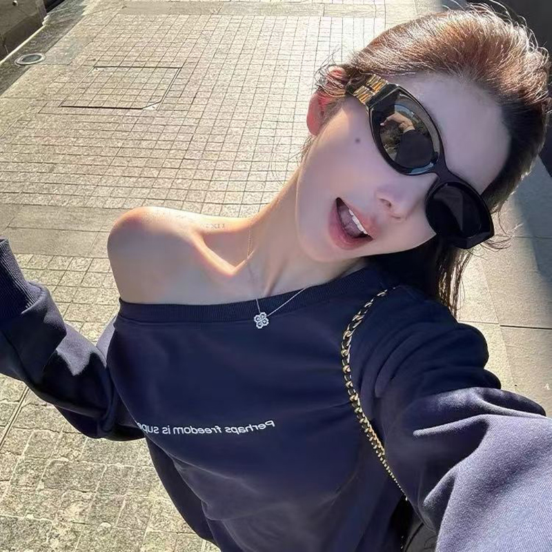 YF7066-图片色港式露肩字母印花慵懒风辣妹时尚薄款设计感大码卫衣
