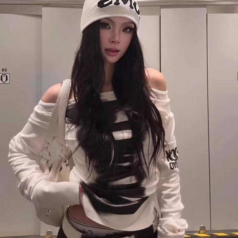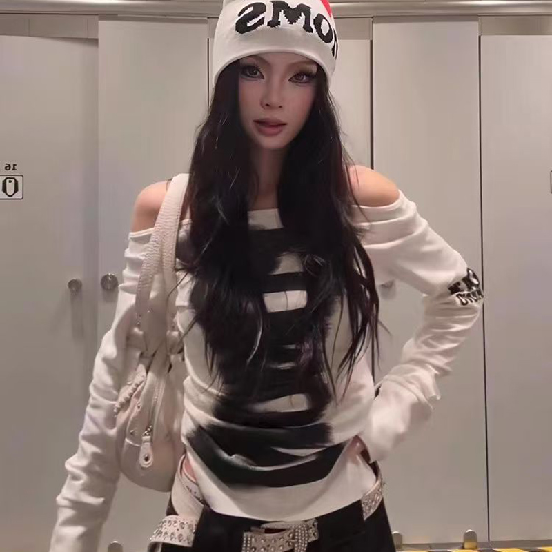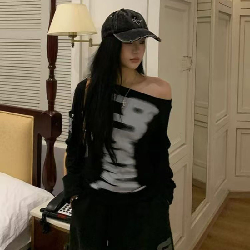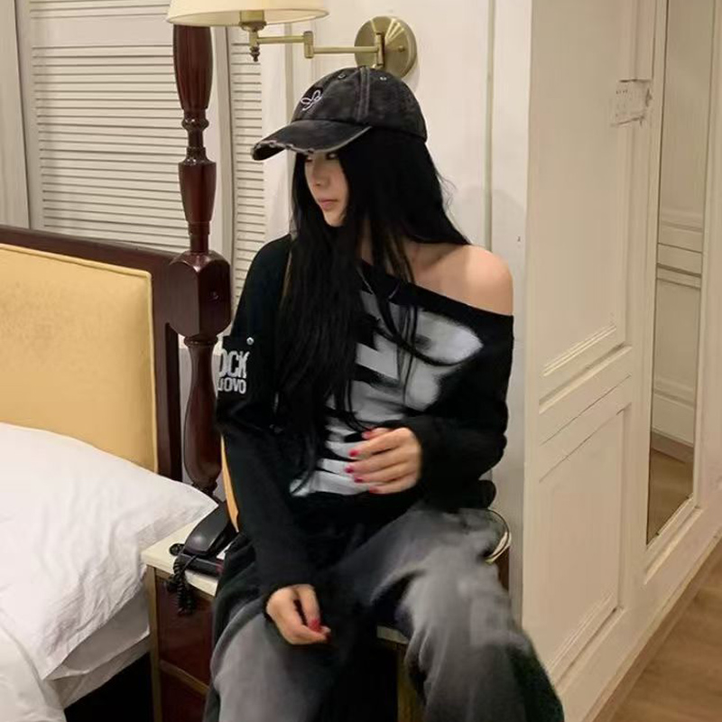 YF7067-(2色入内)韩版性感时尚一字肩字母印花长袖弹力修身显瘦简约风休闲T恤