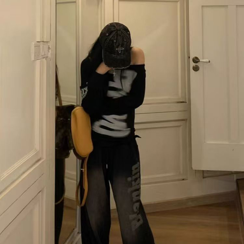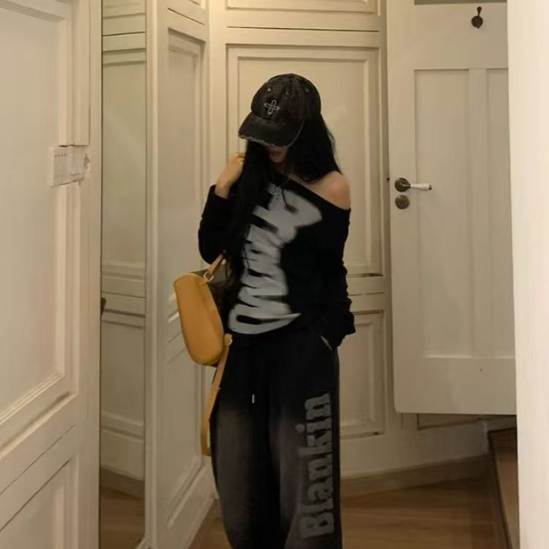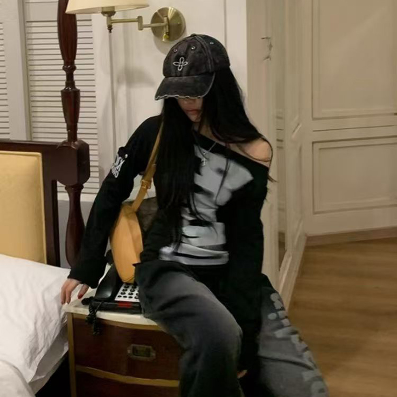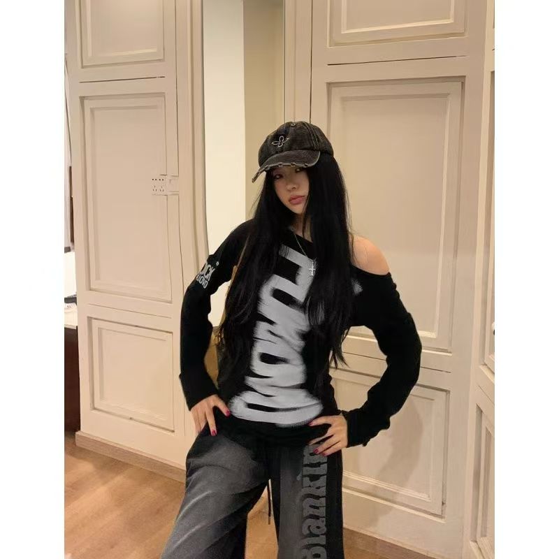 YF7066-图片色港式露肩字母印花慵懒风辣妹时尚薄款设计感大码卫衣