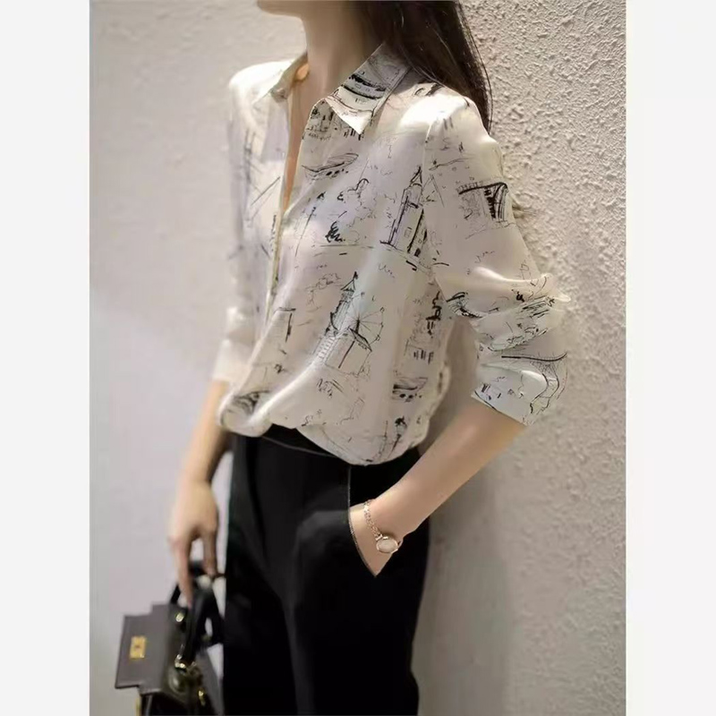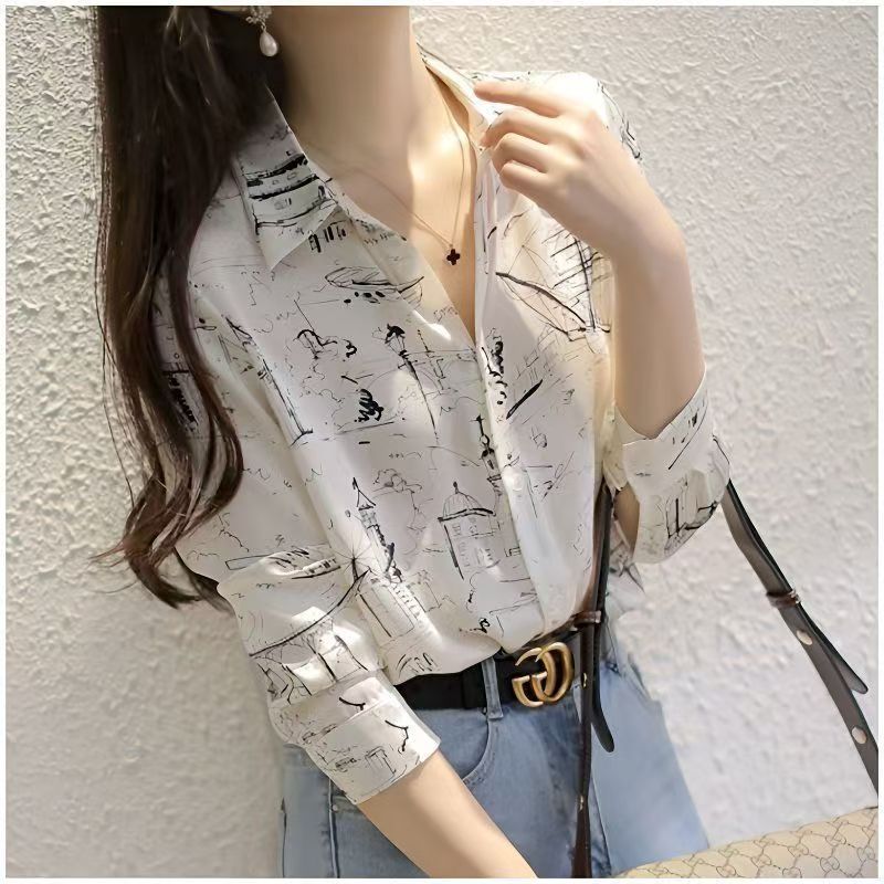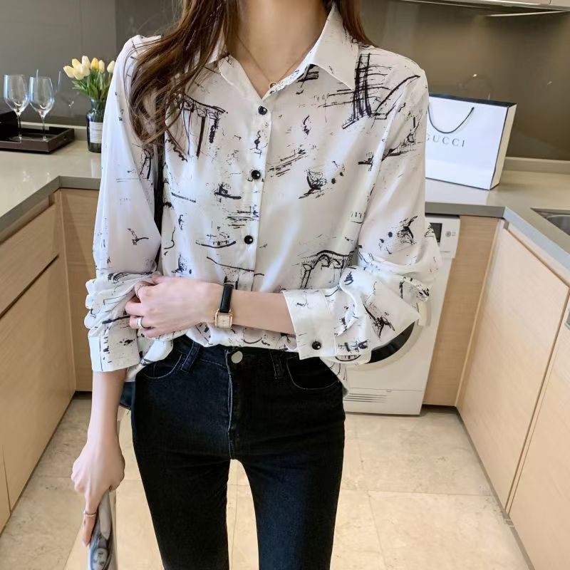 YF7074-图片色春装新款简约个性印花长袖翻领系扣洋气潮流设计感雪纺上衣