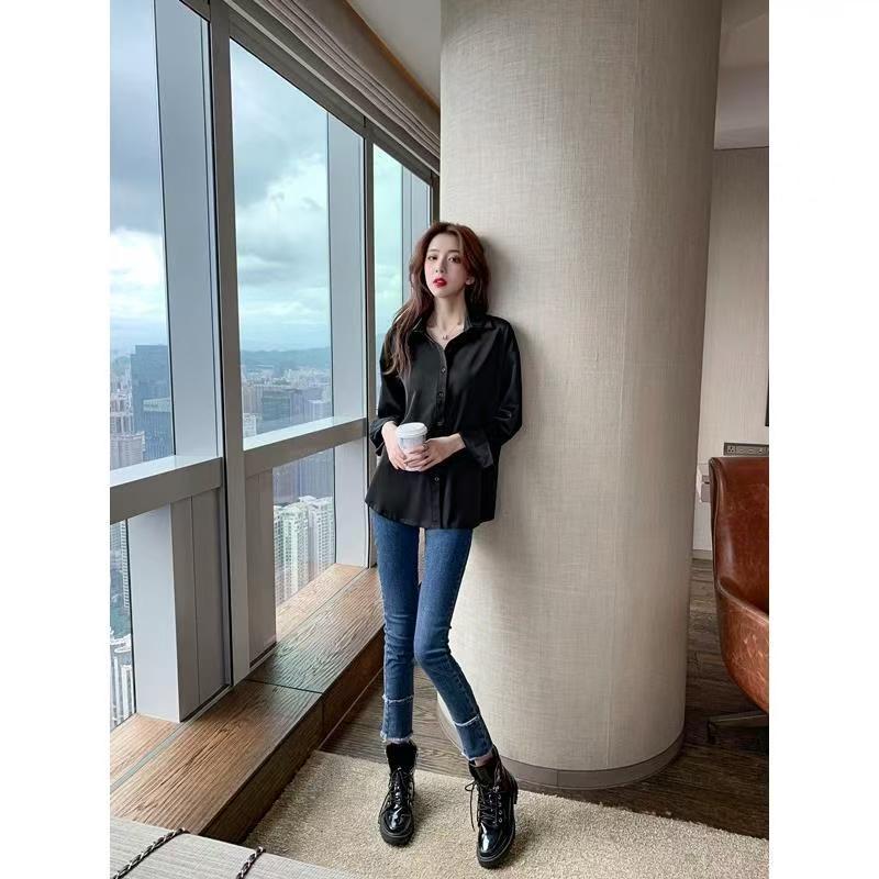 YF7077-图片色轻奢感春季新款POLO领长袖宽松显瘦纯色胖MM显瘦雪纺衫