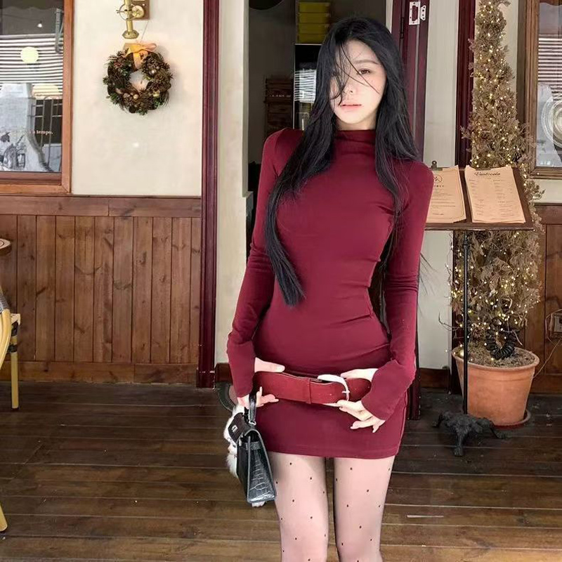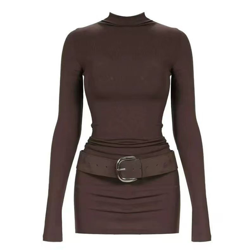 YF7082-(3色入内)时尚春秋磨毛半高领长袖弹力修腰包臀系腰潮流连衣打底裙
