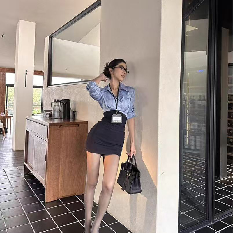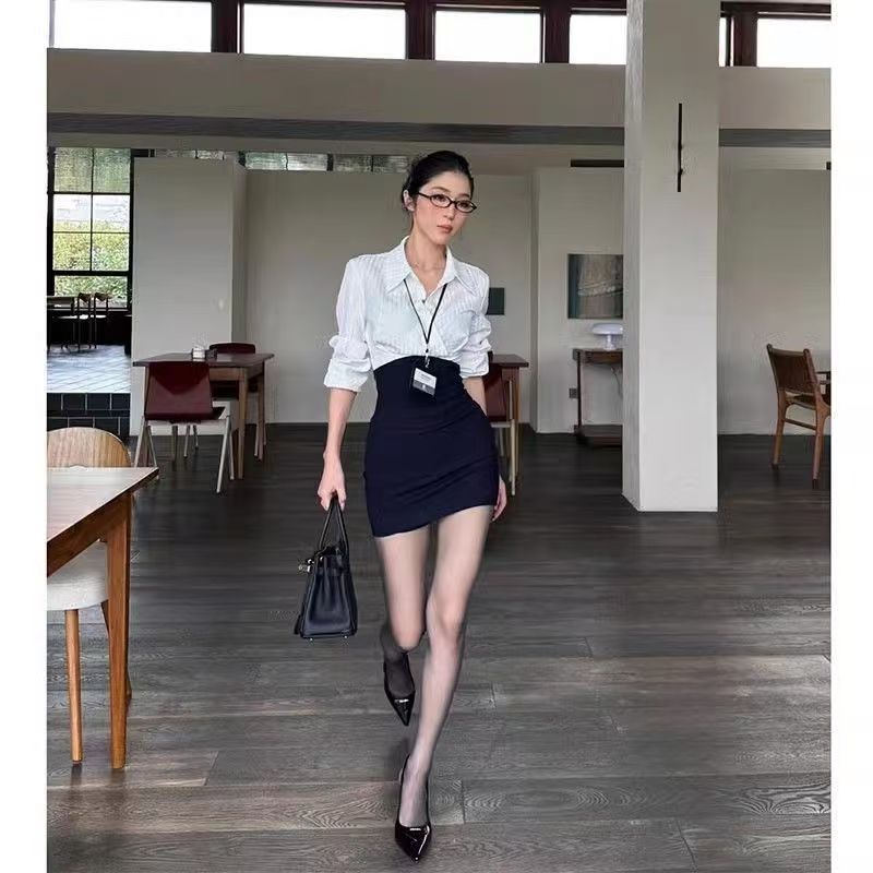YF7084-(2色入内)高级感长袖翻领暗纹撞色设计纯欲风辣妹显瘦港式衬衫