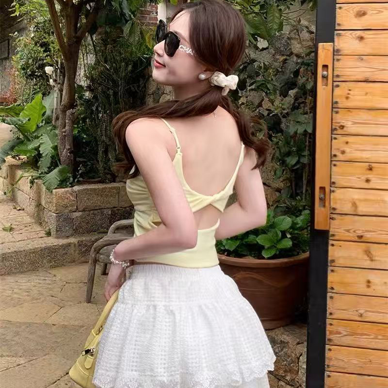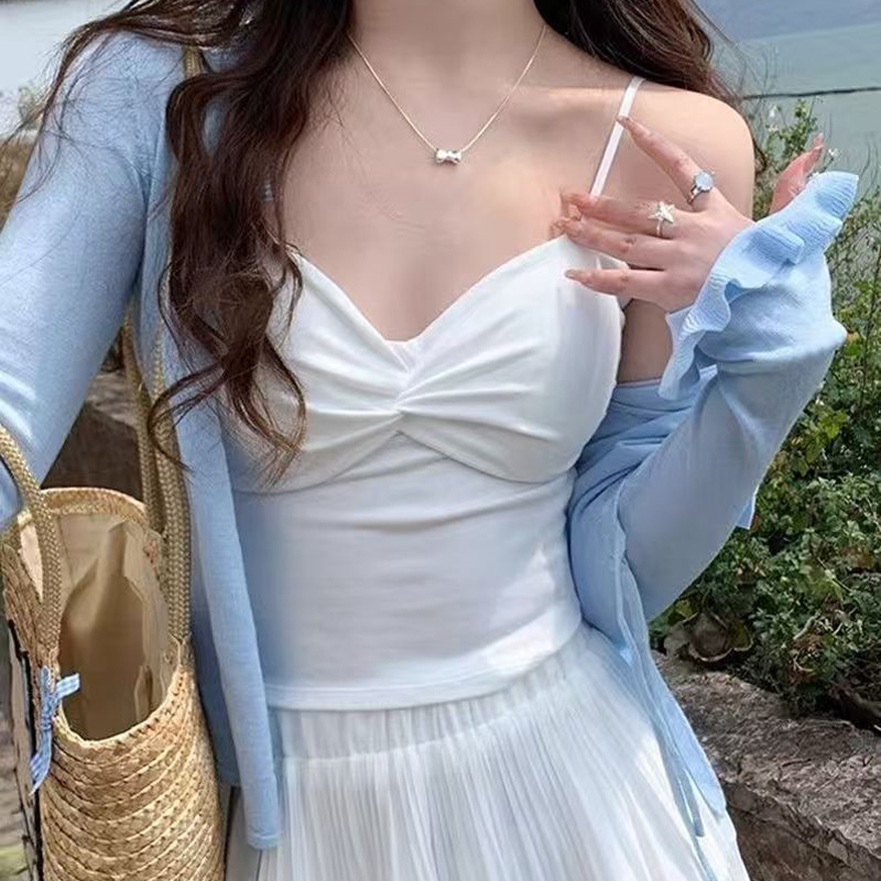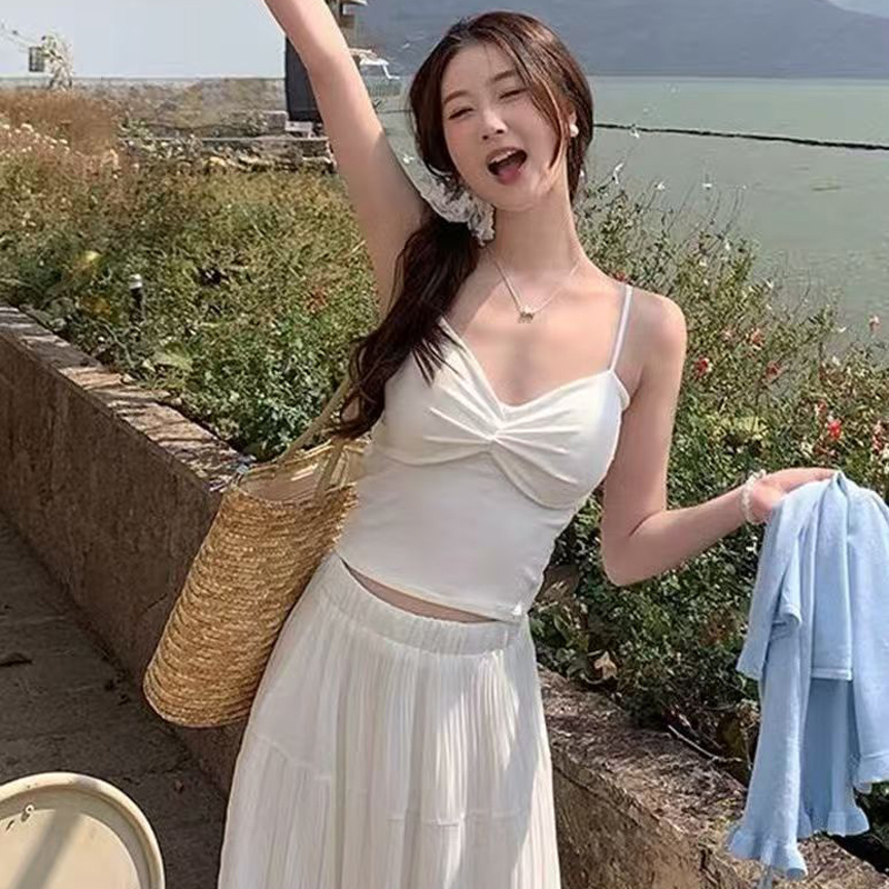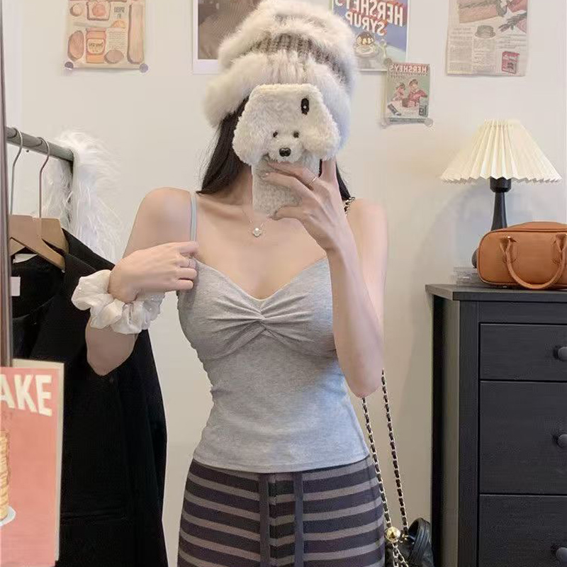 YF7086-(5色入内在)夏季吊带扭纹褶折裹胸弹力收腹显瘦纯欲风纯色背心打底衫
