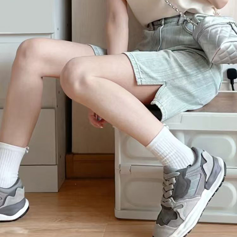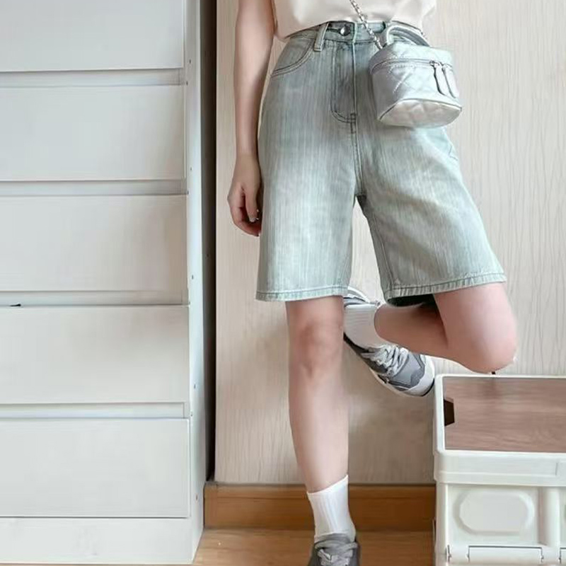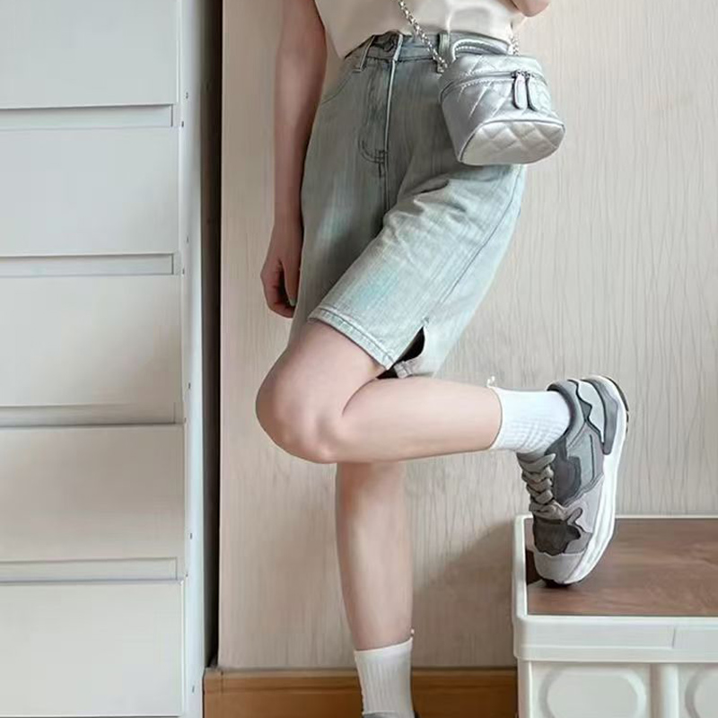 YF7093-图片色时尚夏季港式系扣高腰直筒开叉五分竹节纹浅蓝设计牛仔裤