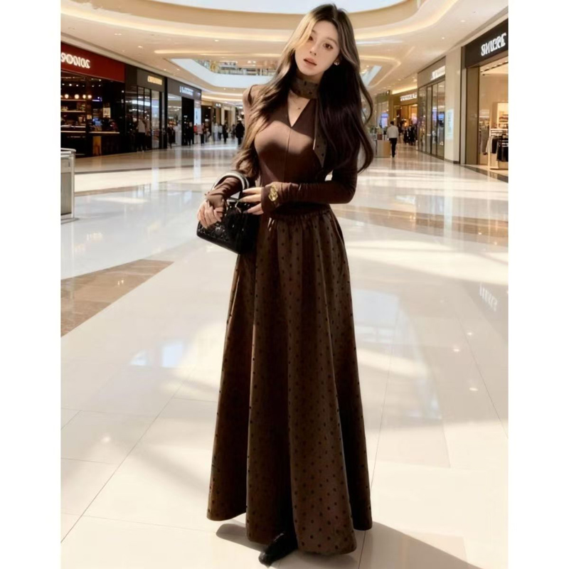 YF7091-(2色入内)纯欲风镂空长袖拼接弹力修腰包臀辣妹设计假两件连衣裙