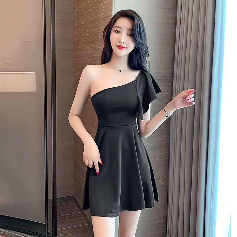 YF7095-(2色入内)纯欲风荷叶边露肩收腰显瘦辣妹设计感纯色抹胸连衣裙