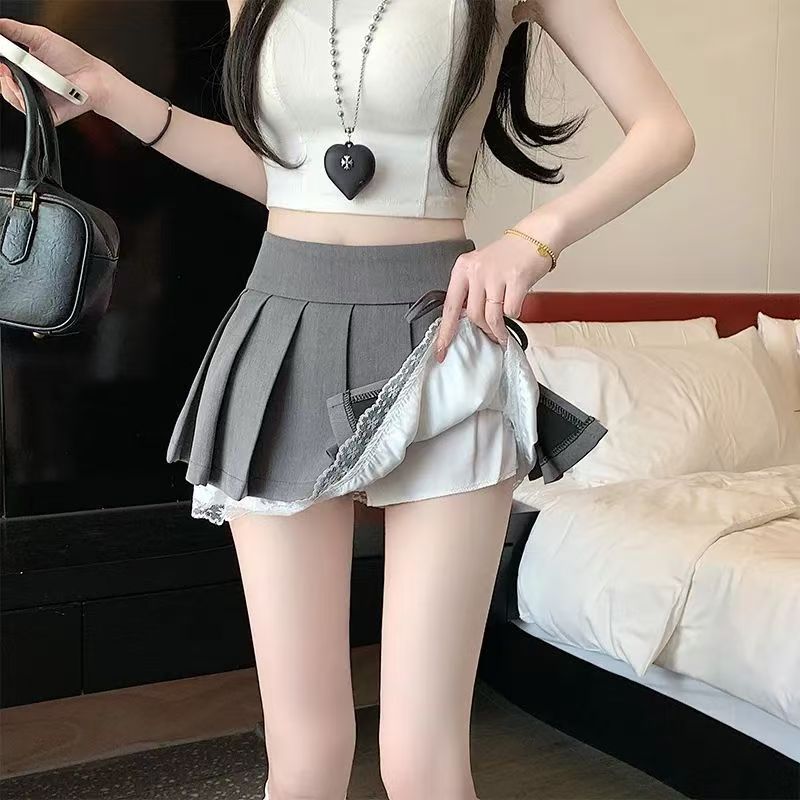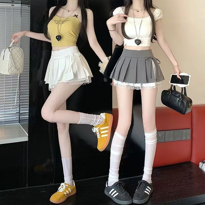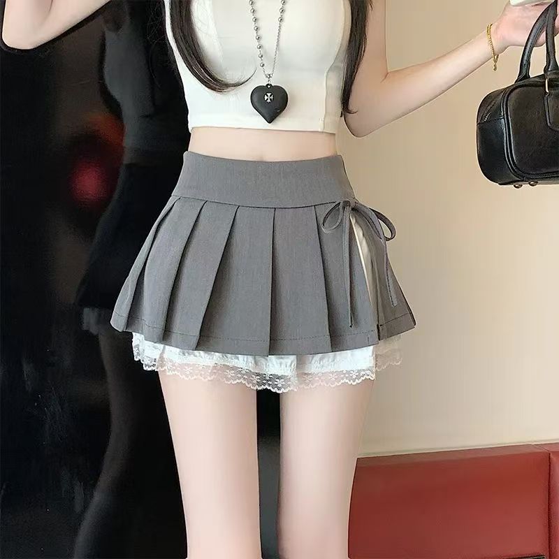 YF7104-(3色入内)甜美时尚原宿风收腹高腰蝴蝶结蕾丝拼接有内衬百褶短