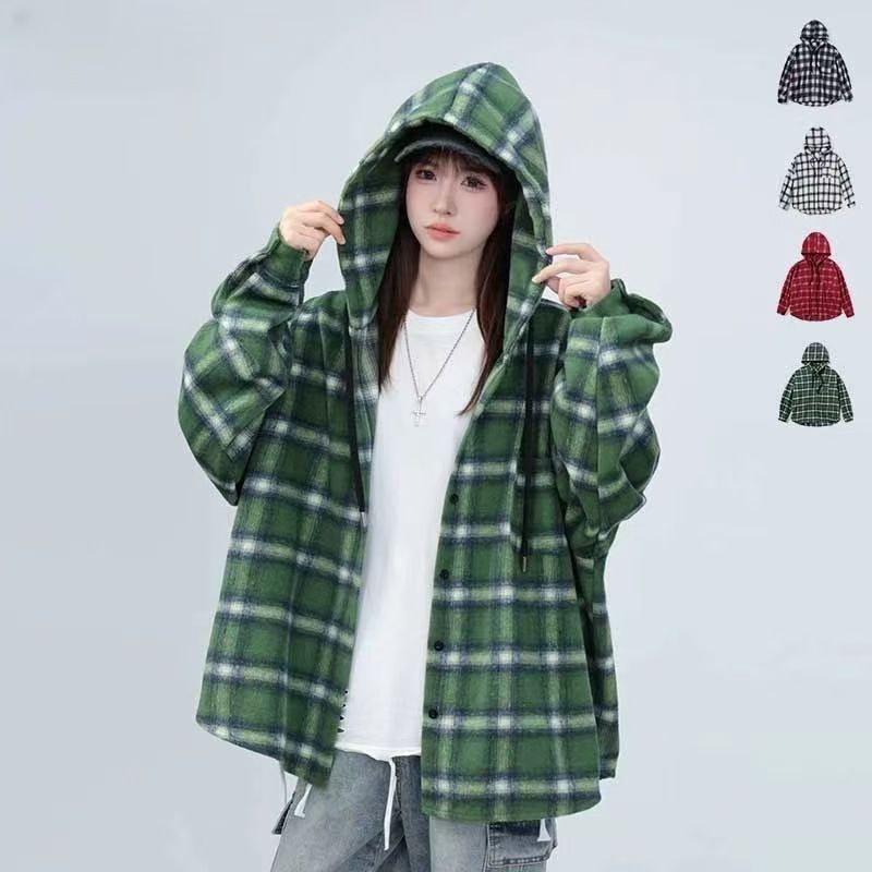YF7106-(5色入内)慵懒风长袖连帽复古格宽松大码学院风春秋百搭休闲上衣