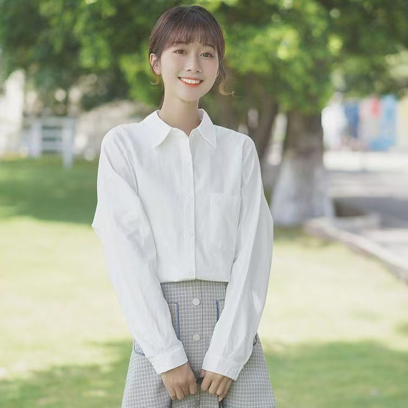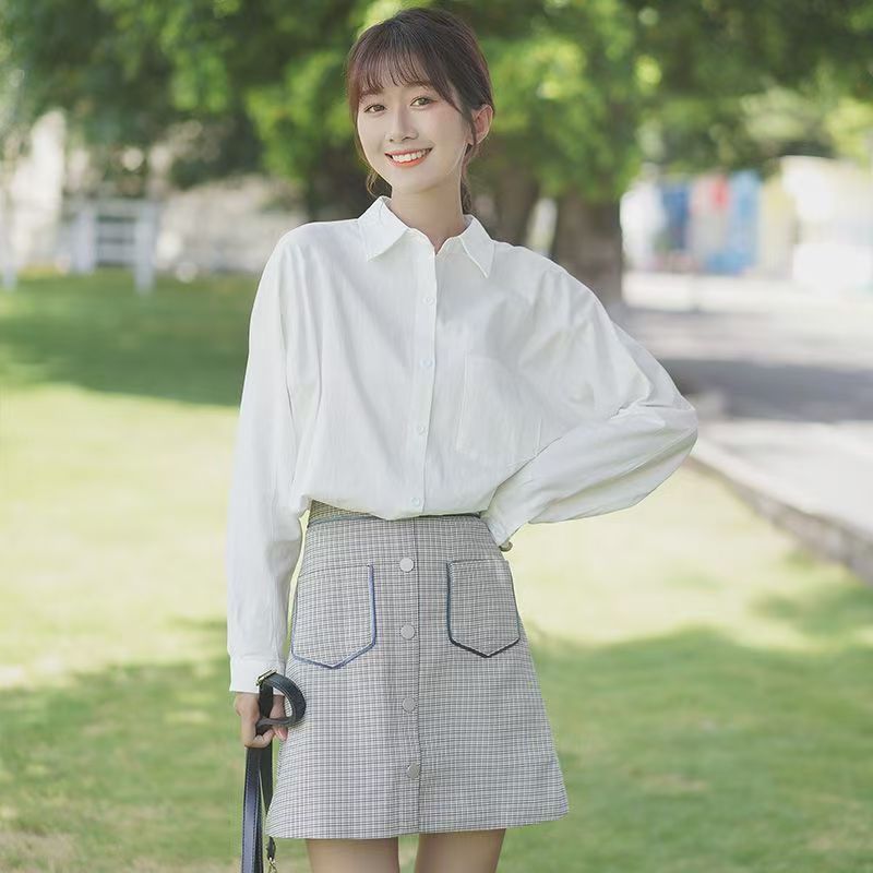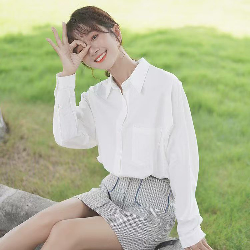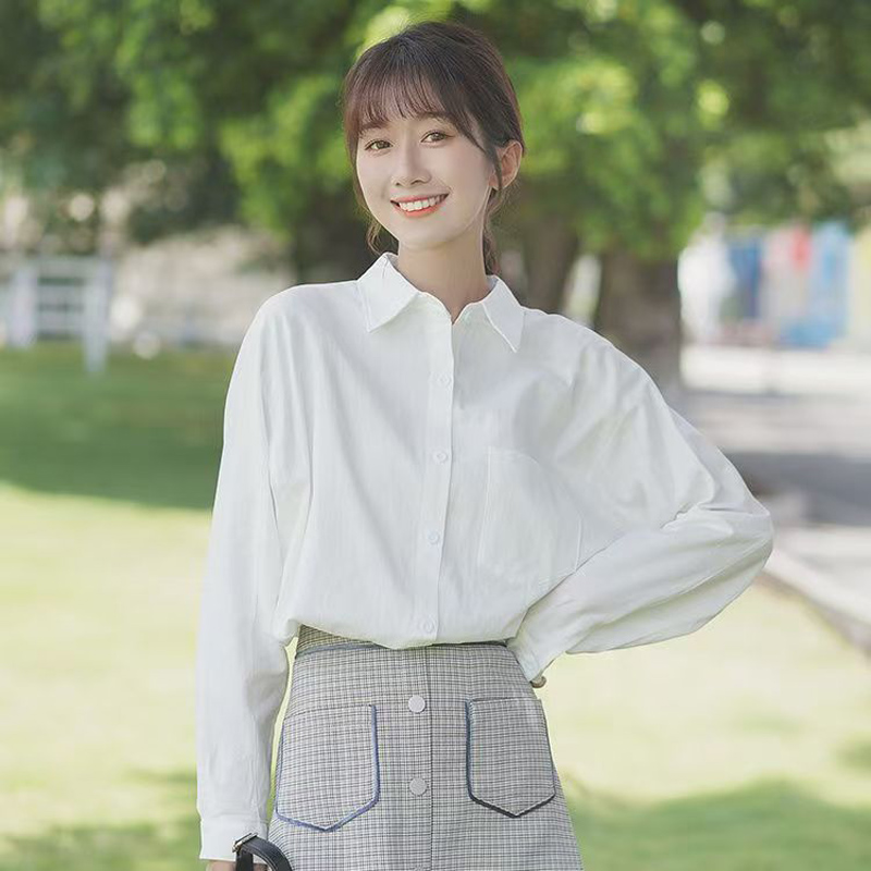 YF7108-图片色白色百搭简约风落肩袖翻领宽松显瘦大码春季时尚气质上衣