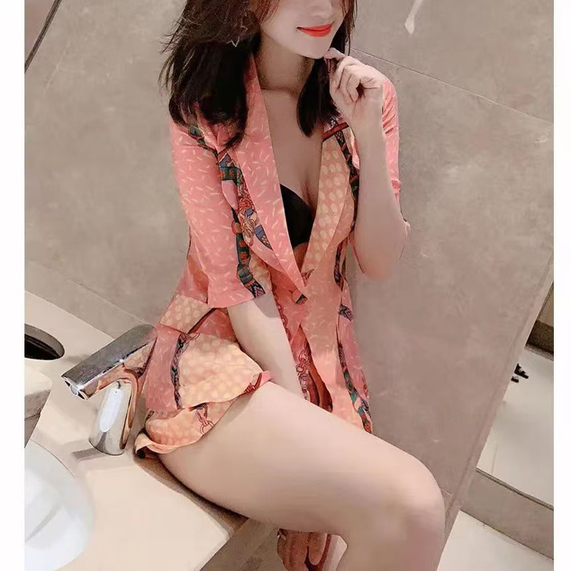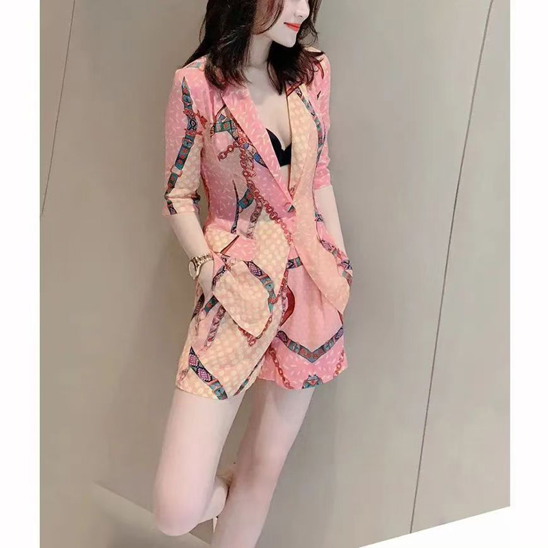 YF7114-图片色两件套夏季洋气印花短袖西装领系扣修身上衣搭高腰短裤套装