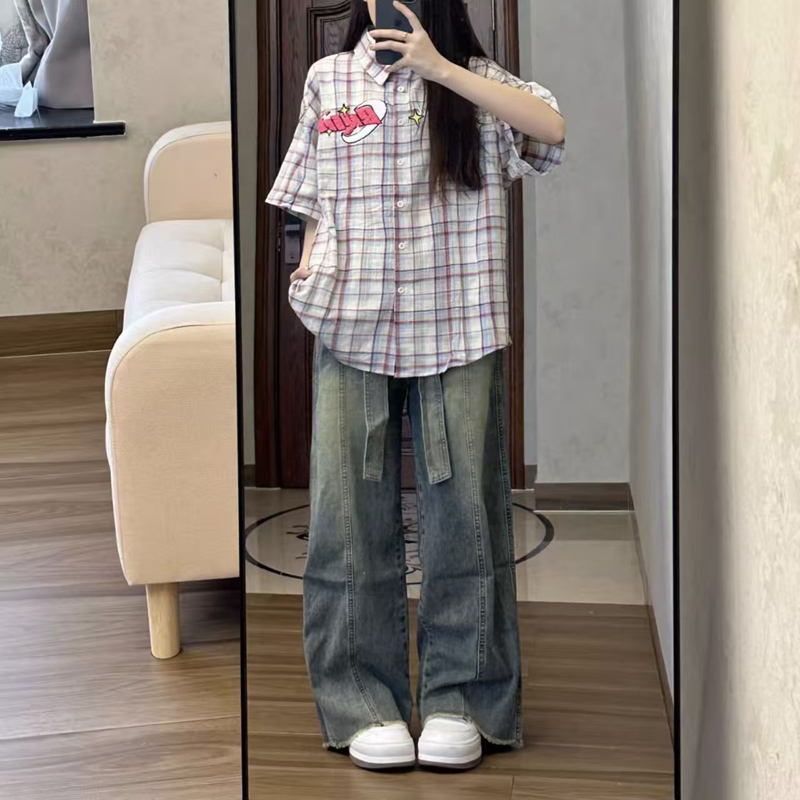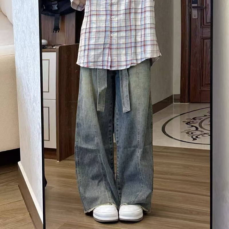 YF7117-图片色港式INS时尚绑带系腰直筒坠地感复古风阔腿显瘦牛仔裤