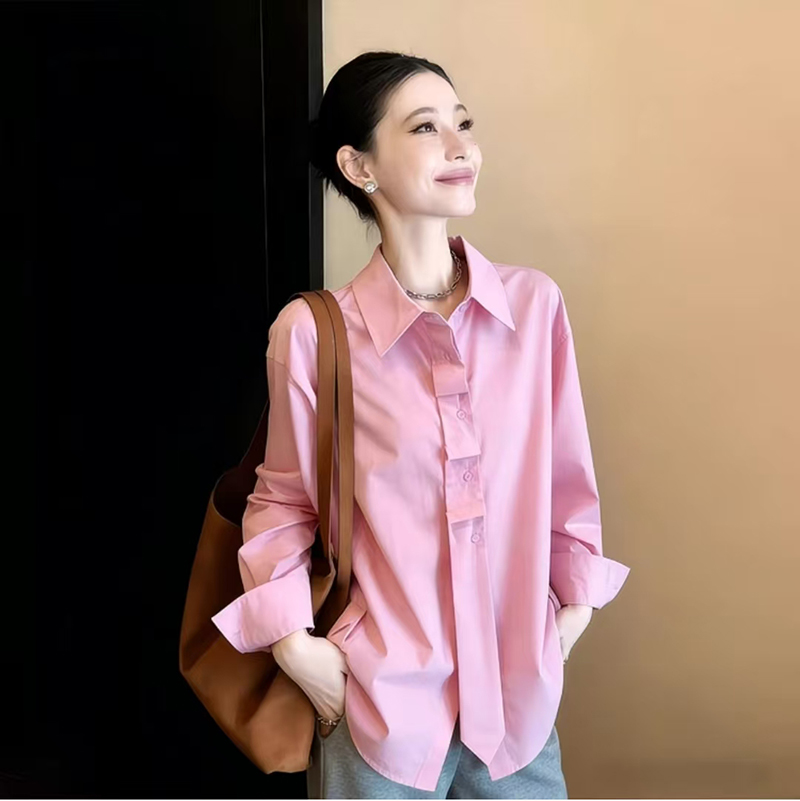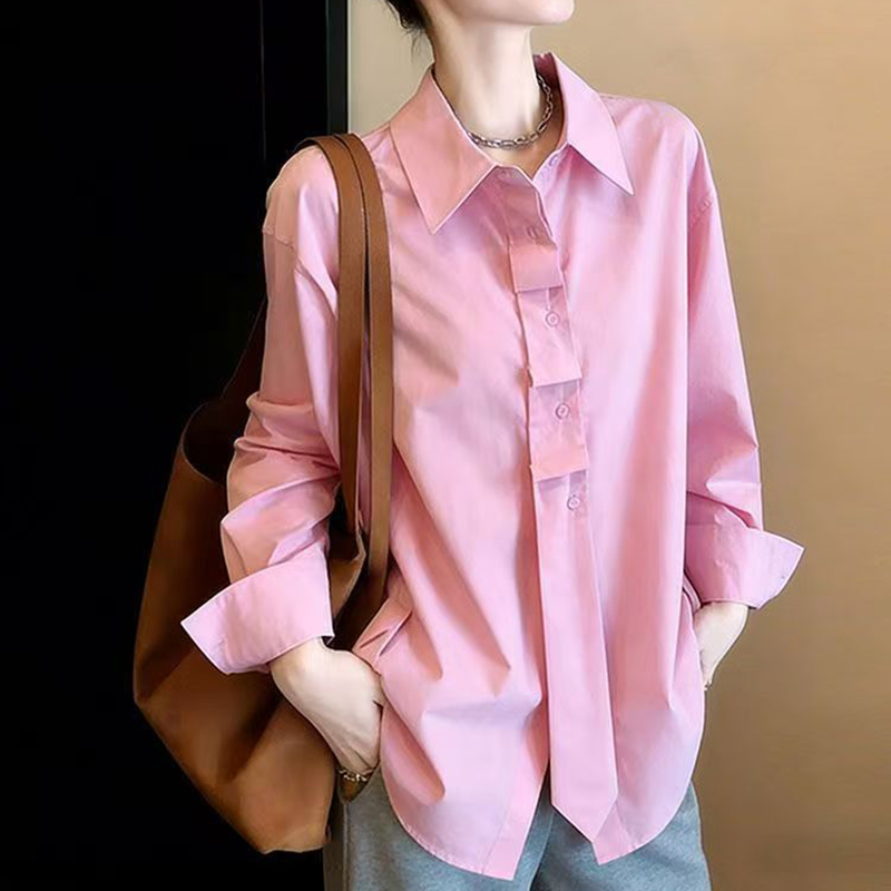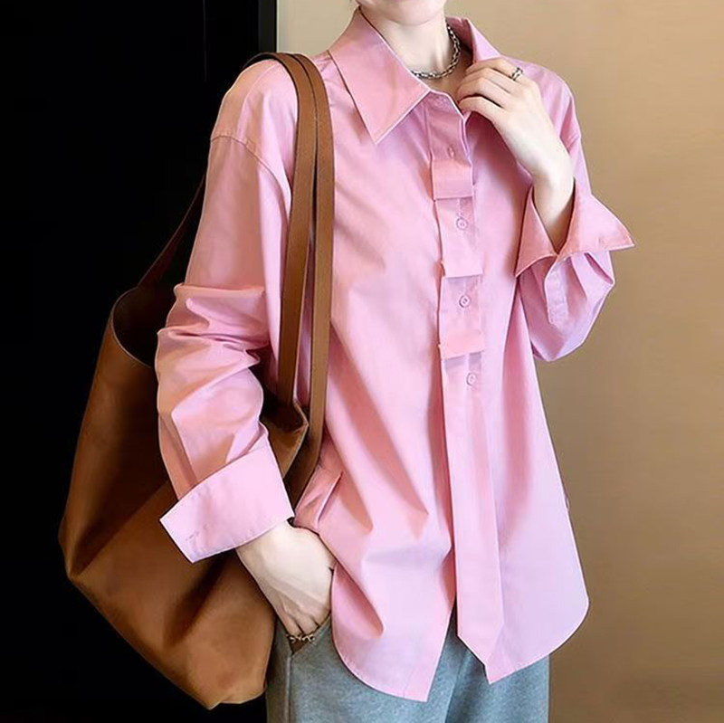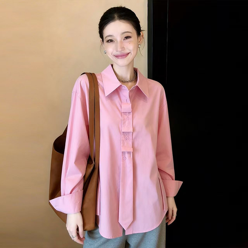 YF7131-(2色入内)韩版小众春夏新款小心机褶折感领带系扣长袖翻领休闲衬衫