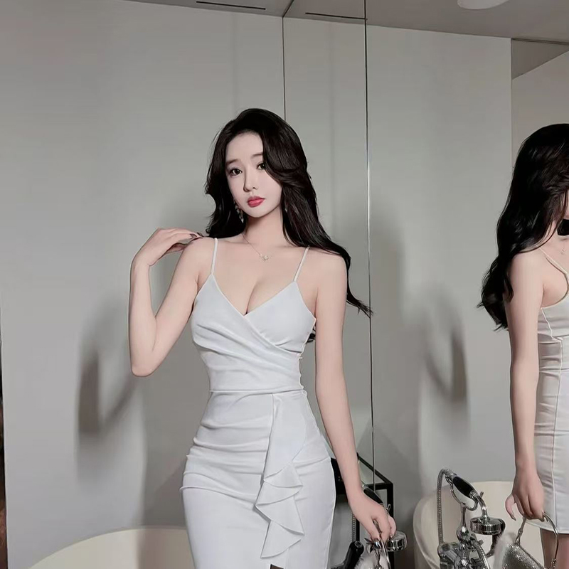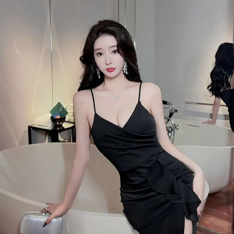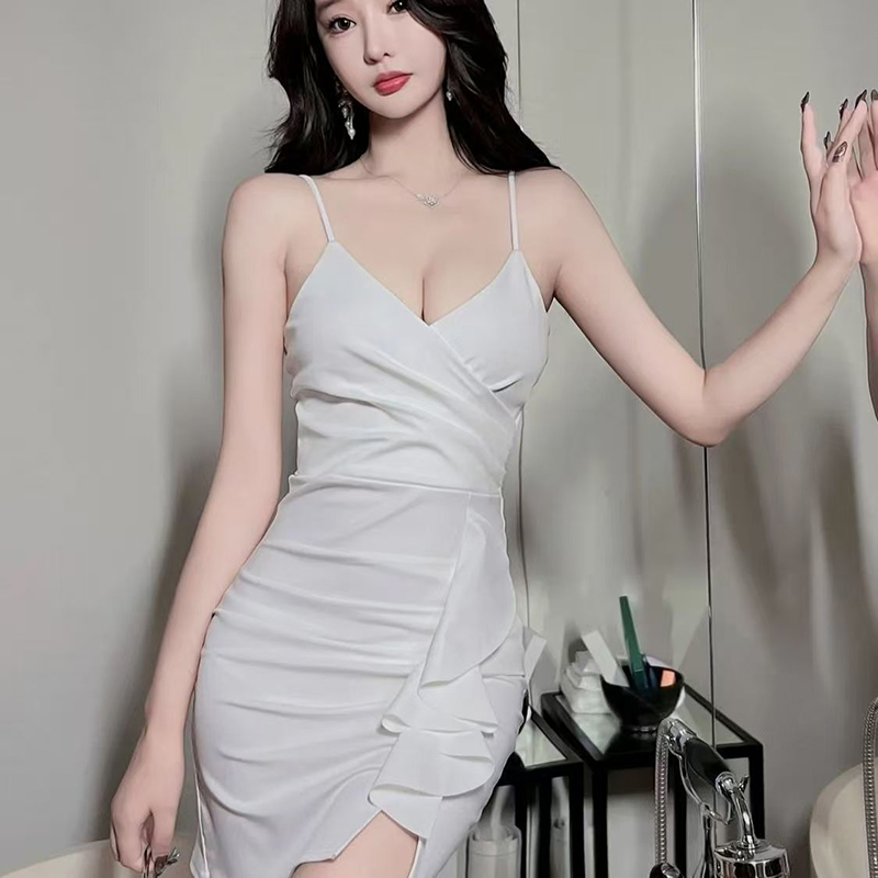 YF7132-(3色入内)名媛气质吊带交叉收腰弹力包臀荷叶边飘带开叉连衣裙