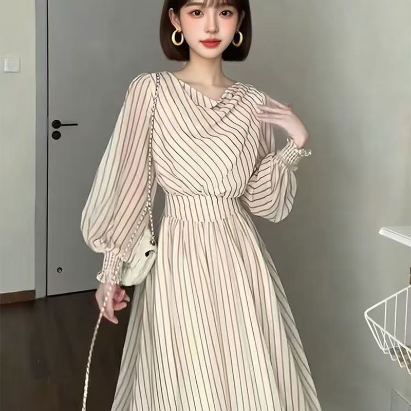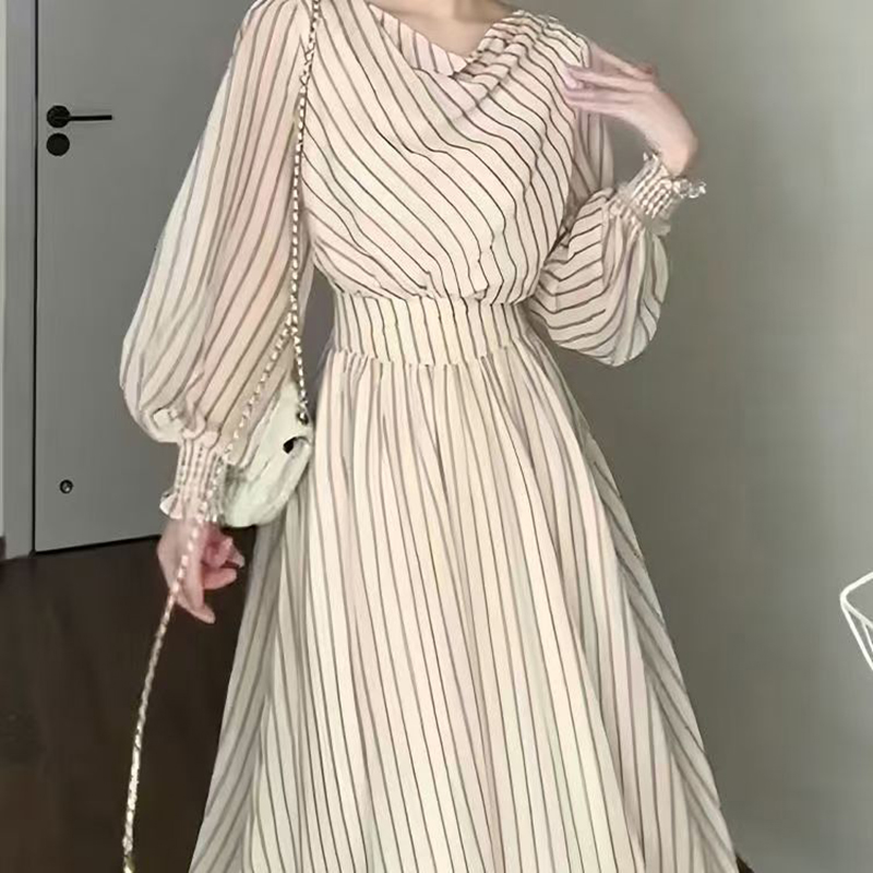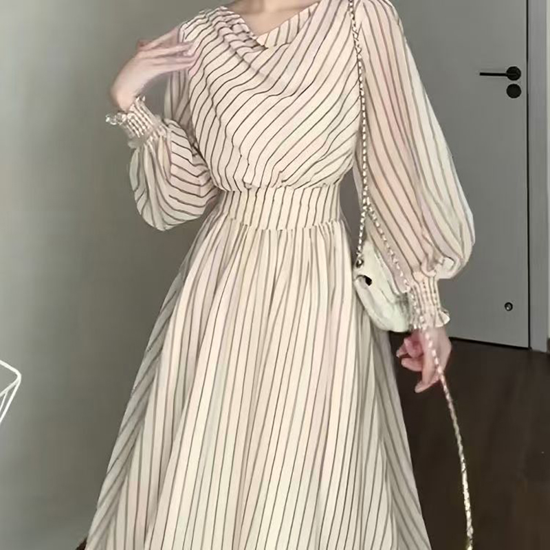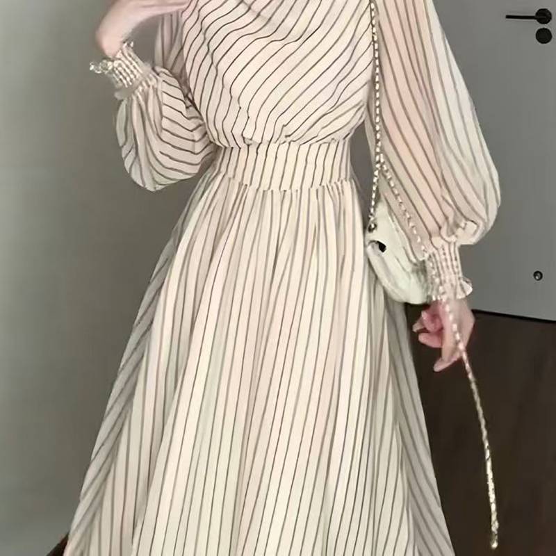YF7139-图片色优雅时尚泡泡袖套头收腰大摆条纹中长款新款韩版连衣裙