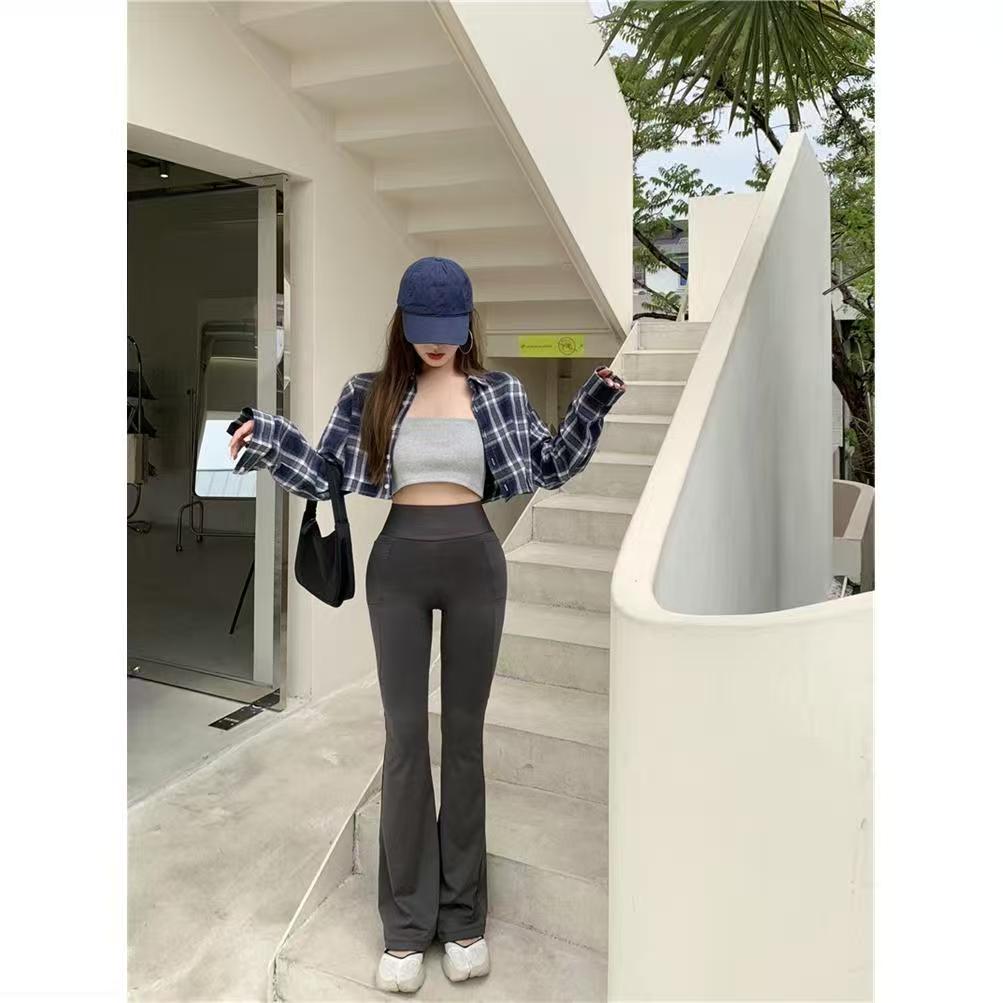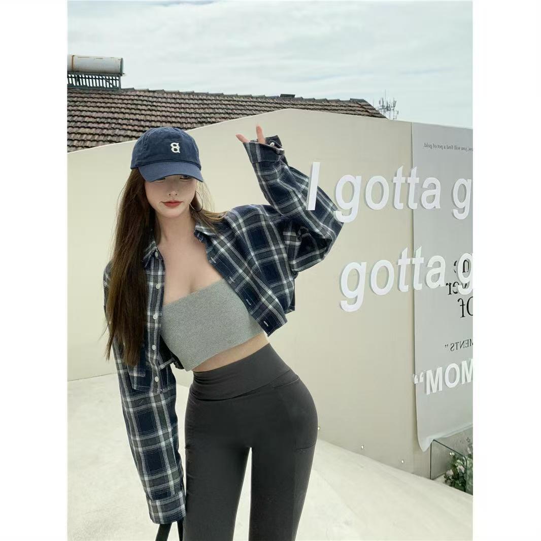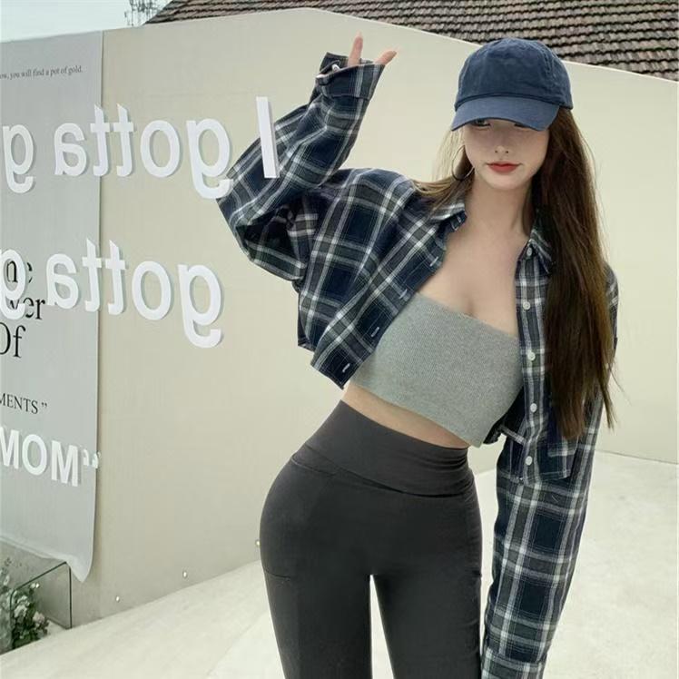 YF7142-图片色夏季新款长袖翻领系扣短装露脐辣妹设计港式复古格子衬衣