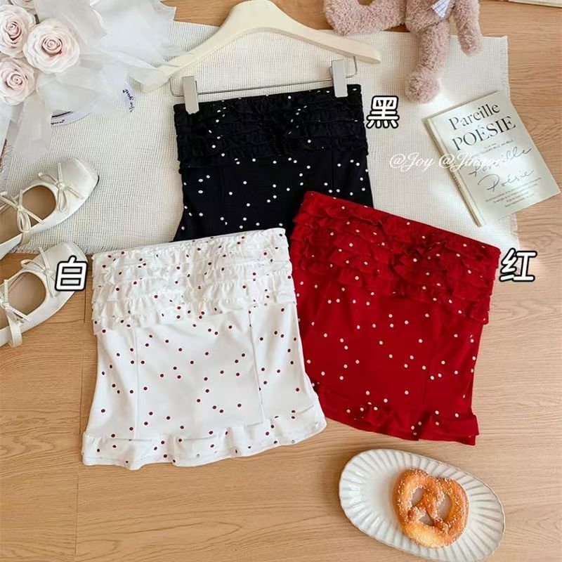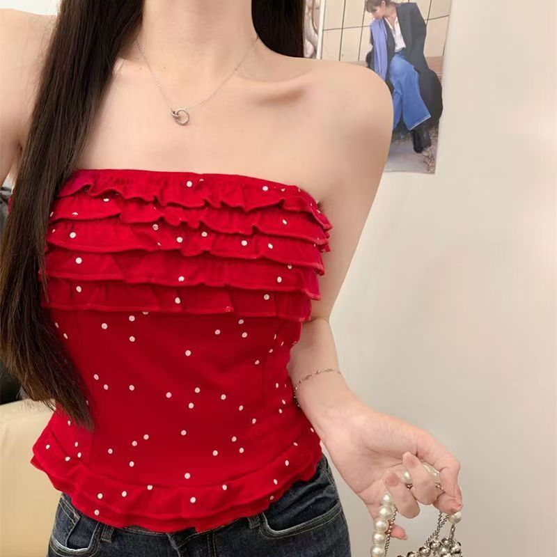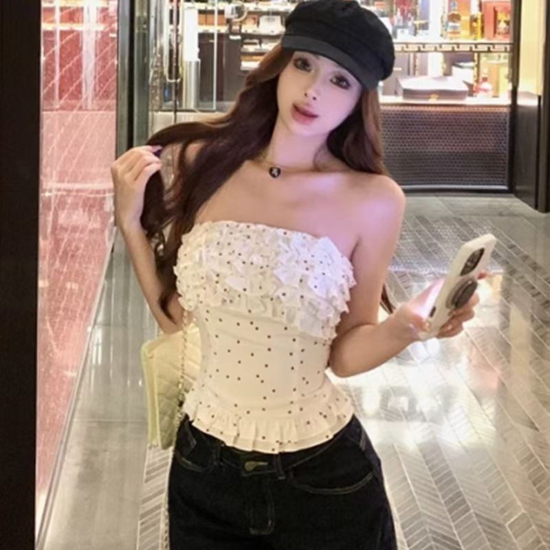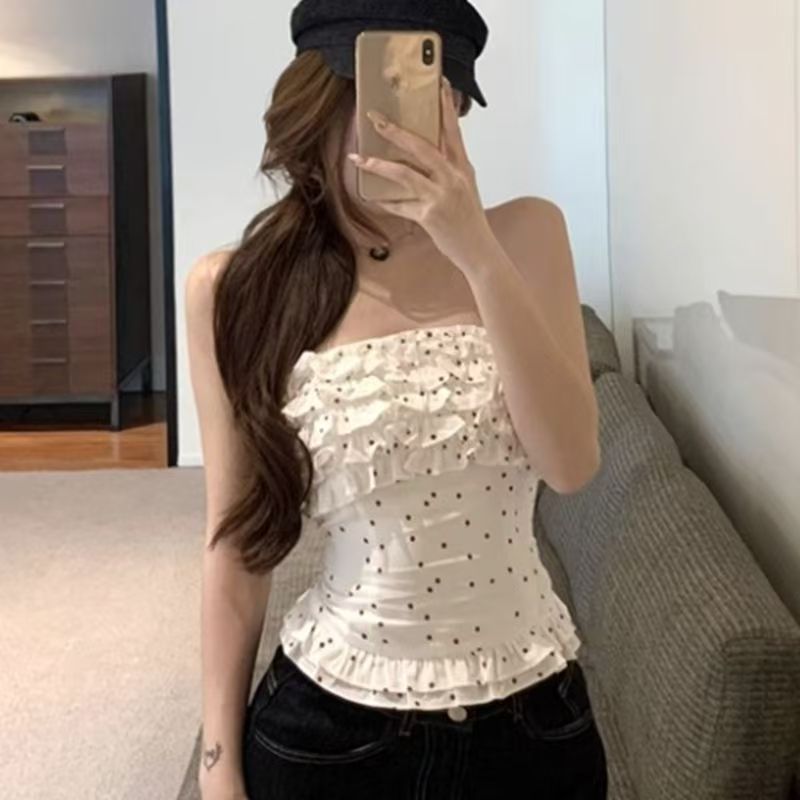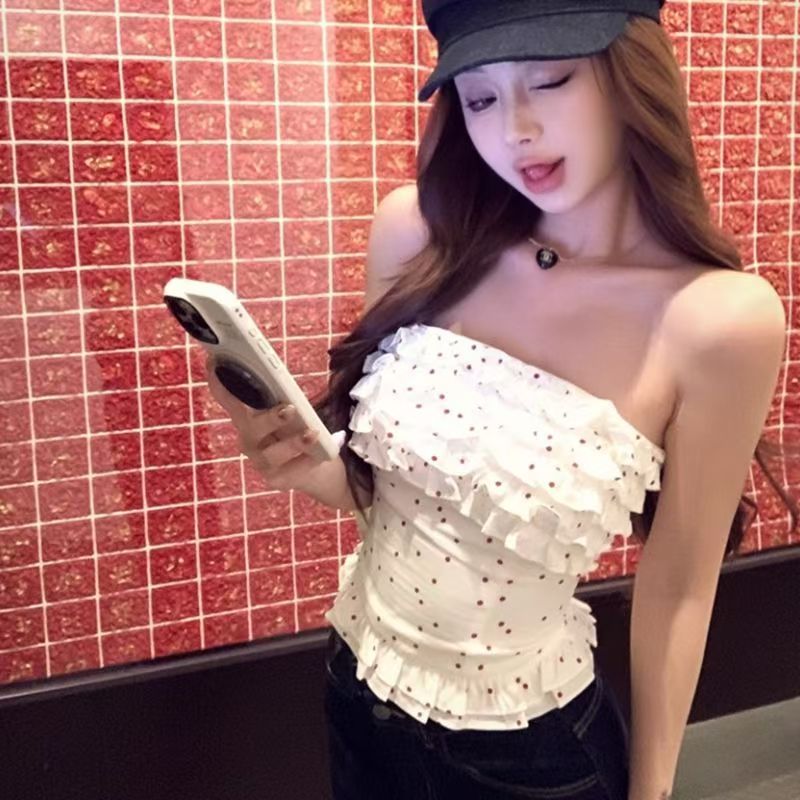 YF7147-(3色入内)夏季纯欲风一字抹胸荷叶边波点弹力收腹显瘦带胸垫上衣