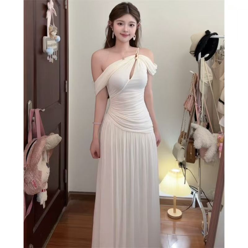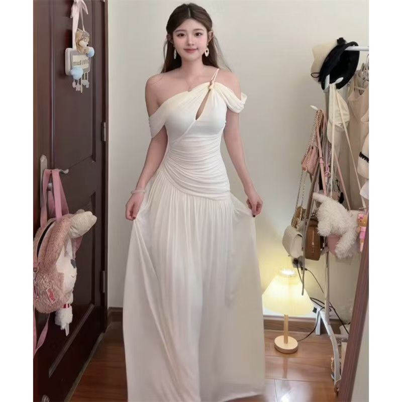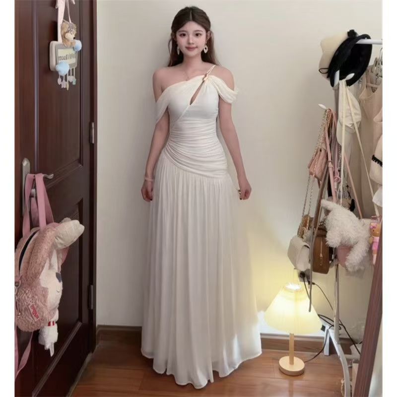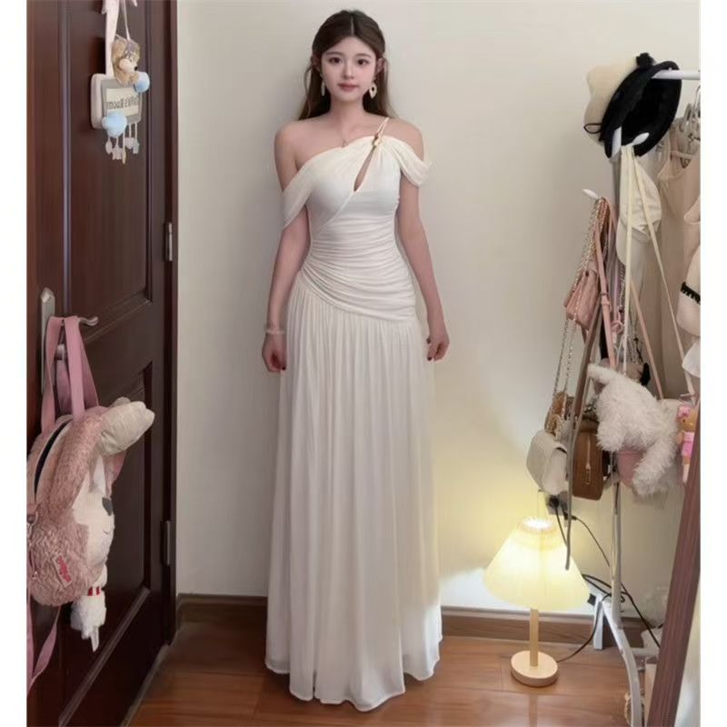 YF7148-图片色法式夏季名媛气质一字肩褶折收腹显瘦蕾丝新款礼服长裙