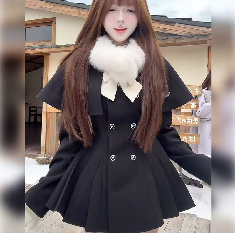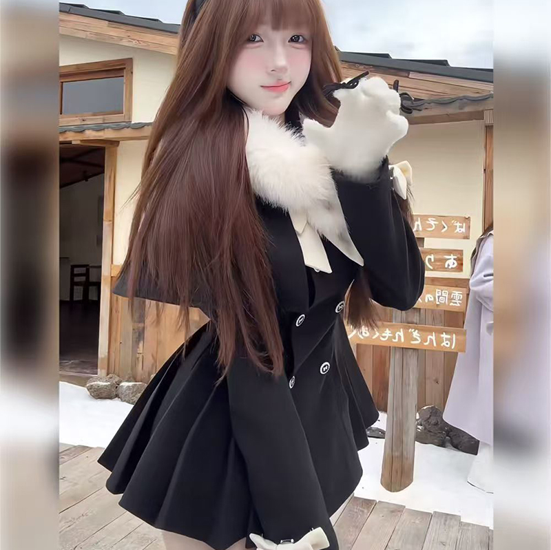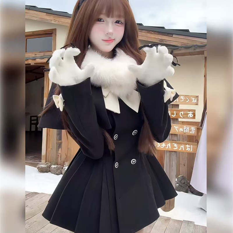YF7169-图片色甜美时尚经典黑色长袖双排扣褶折修身显瘦高级感风衣外套