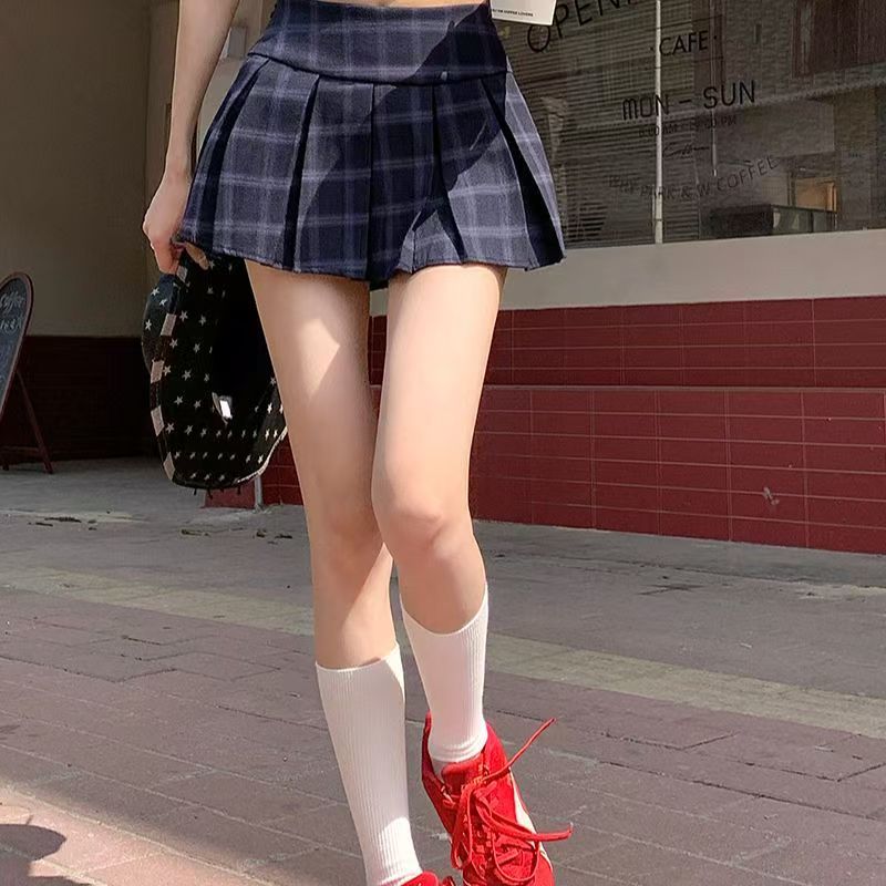 YF7182-图片色日系原宿风收腹低腰A字褶折防走光复古蓝设计感短裙