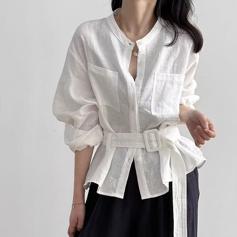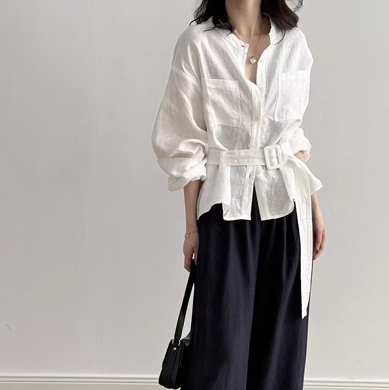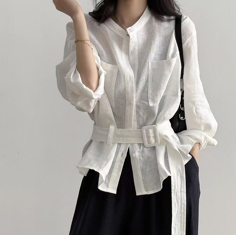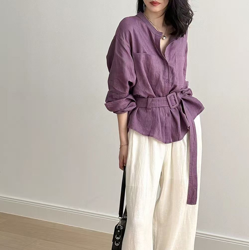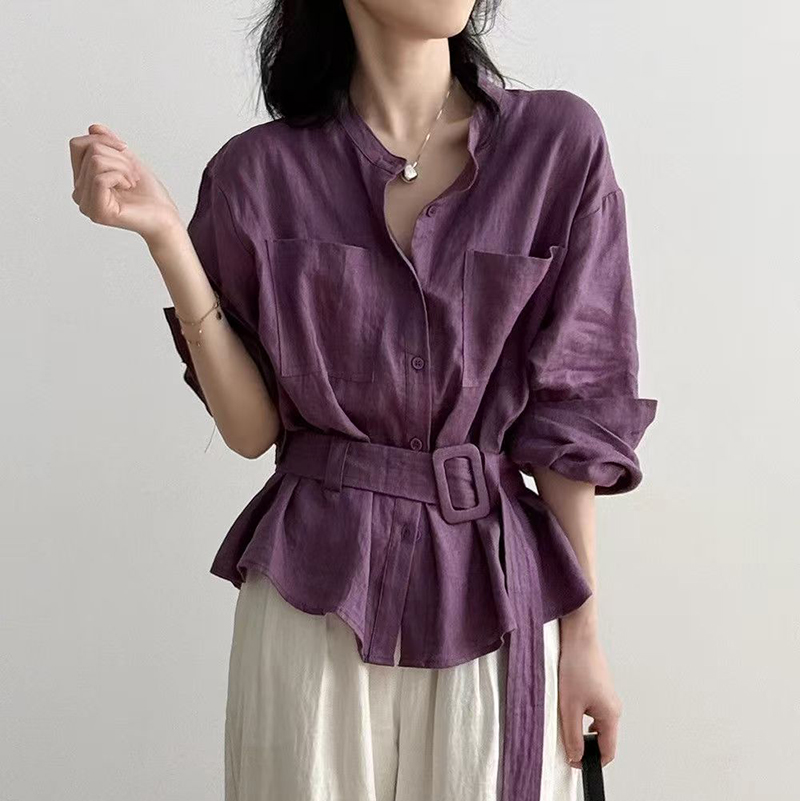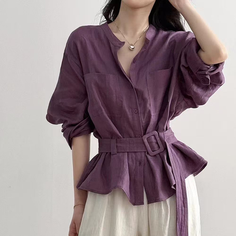 YF7183-(2色入内)薄装夏季文艺风立领系扣双口袋可调腰带纯色长袖大码显瘦上衣