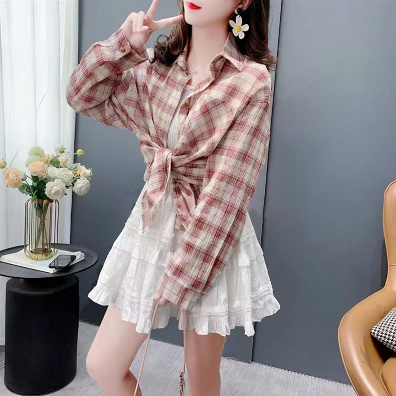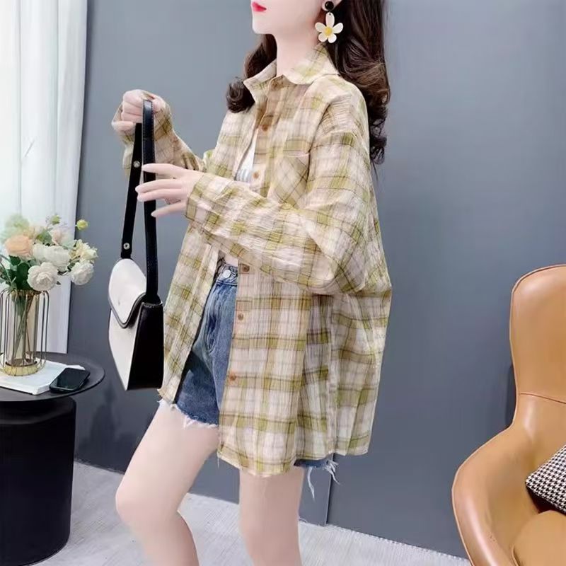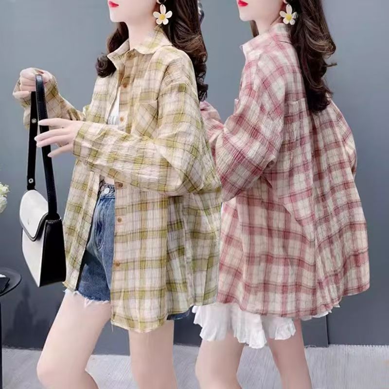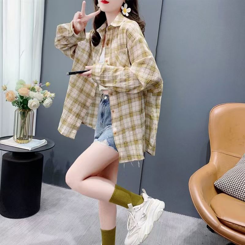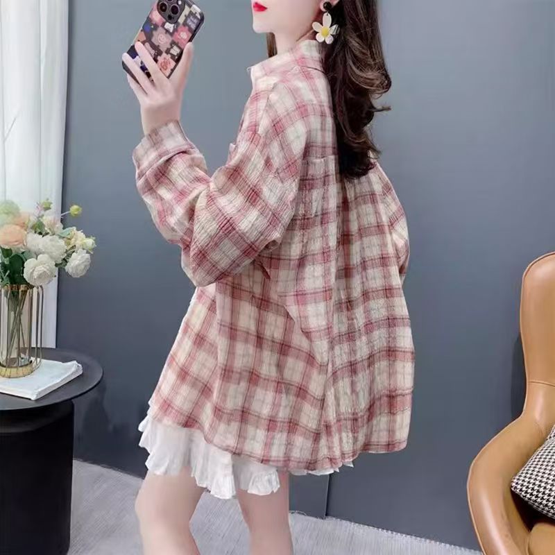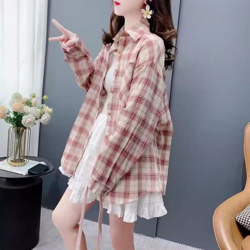 YF7184-(2色入内)复古格子衬衫韩版新款薄装长袖翻领大码慵懒风设计上衣