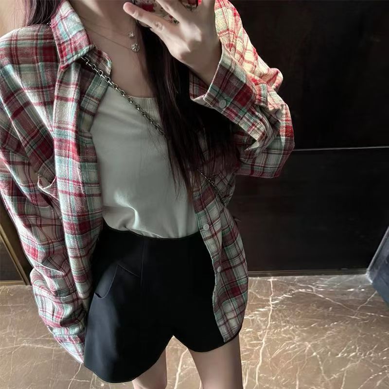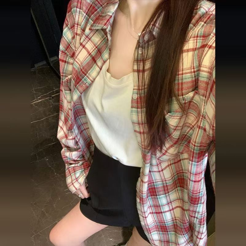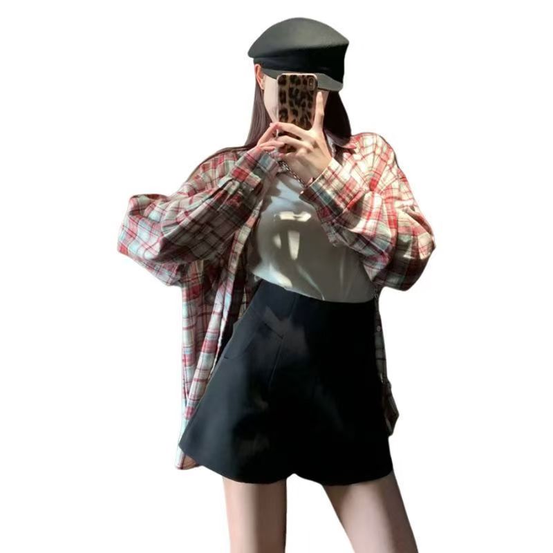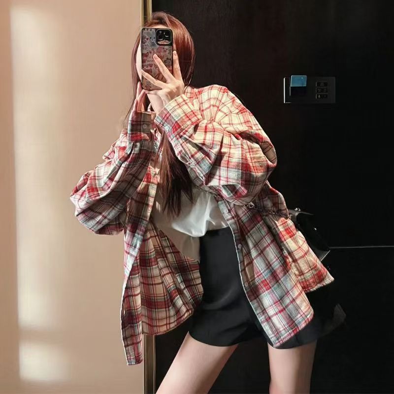 YF7194-图片色韩版慵懒风胖MM显瘦大码复古磨毛格子休闲百搭潮流上衣