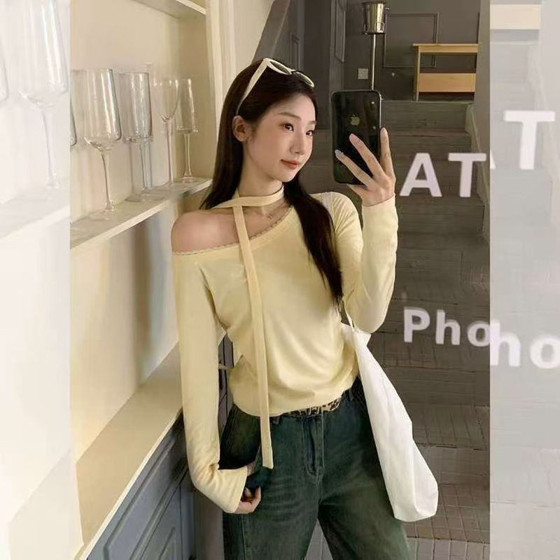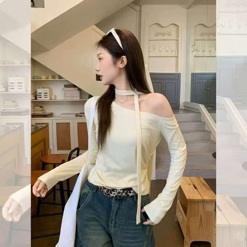 YF7201-图片色纯欲风露单肩设计感长袖围脖飘带宽松显瘦韩版新款T恤