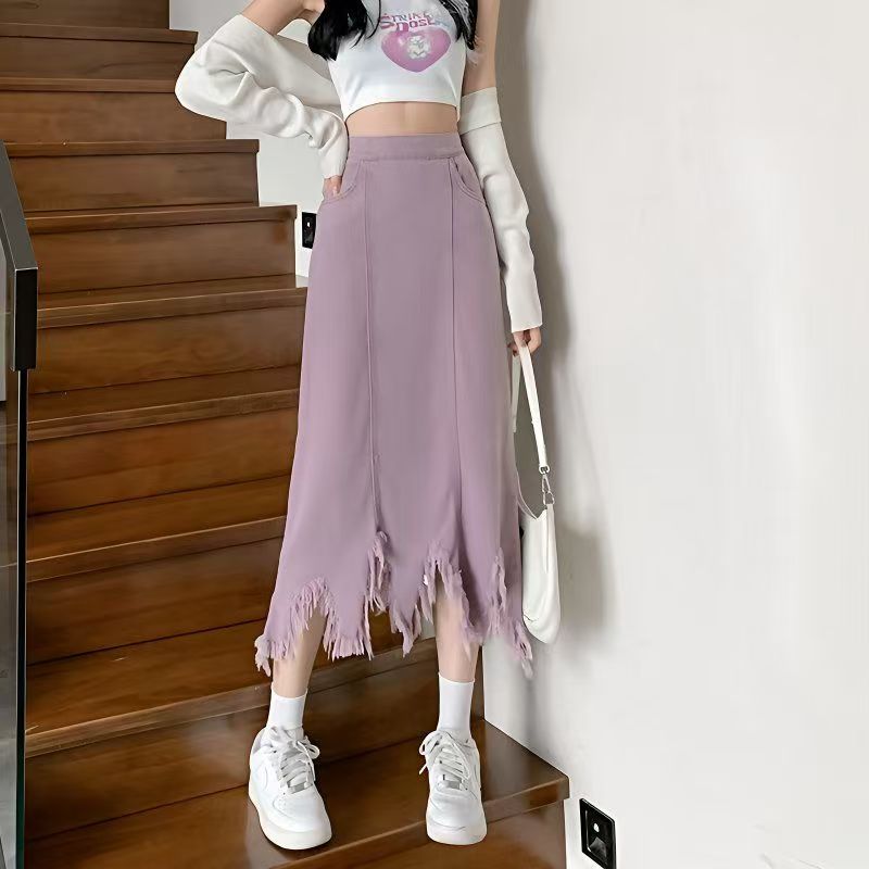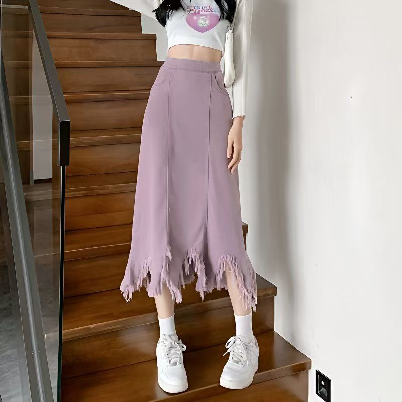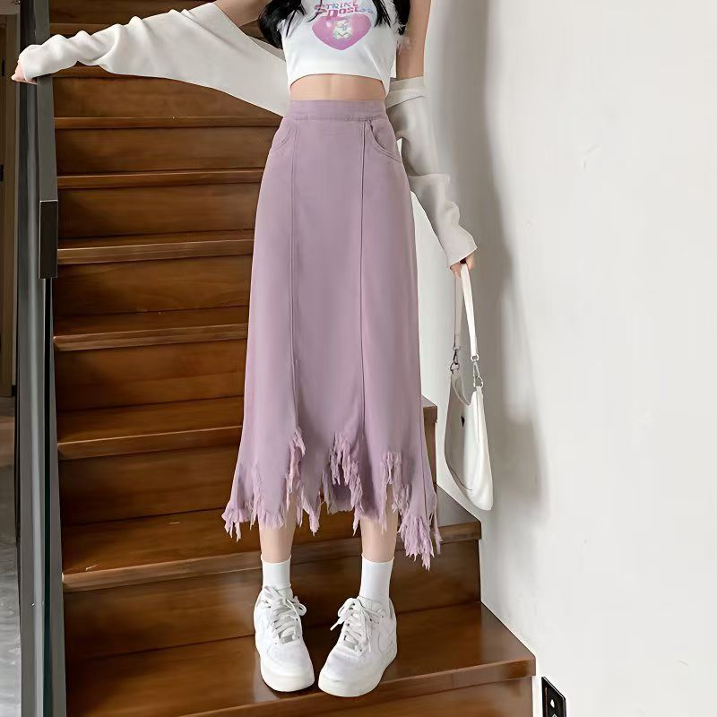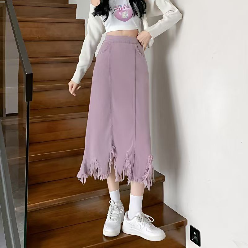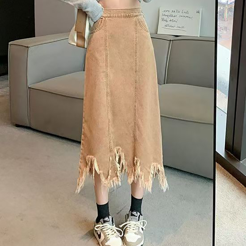 YF7209-(2色入内时尚个性不规则流苏设计中长款韩版新款牛仔半身裙