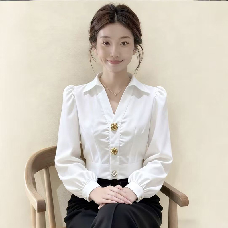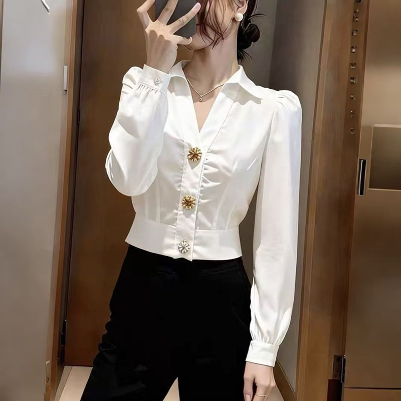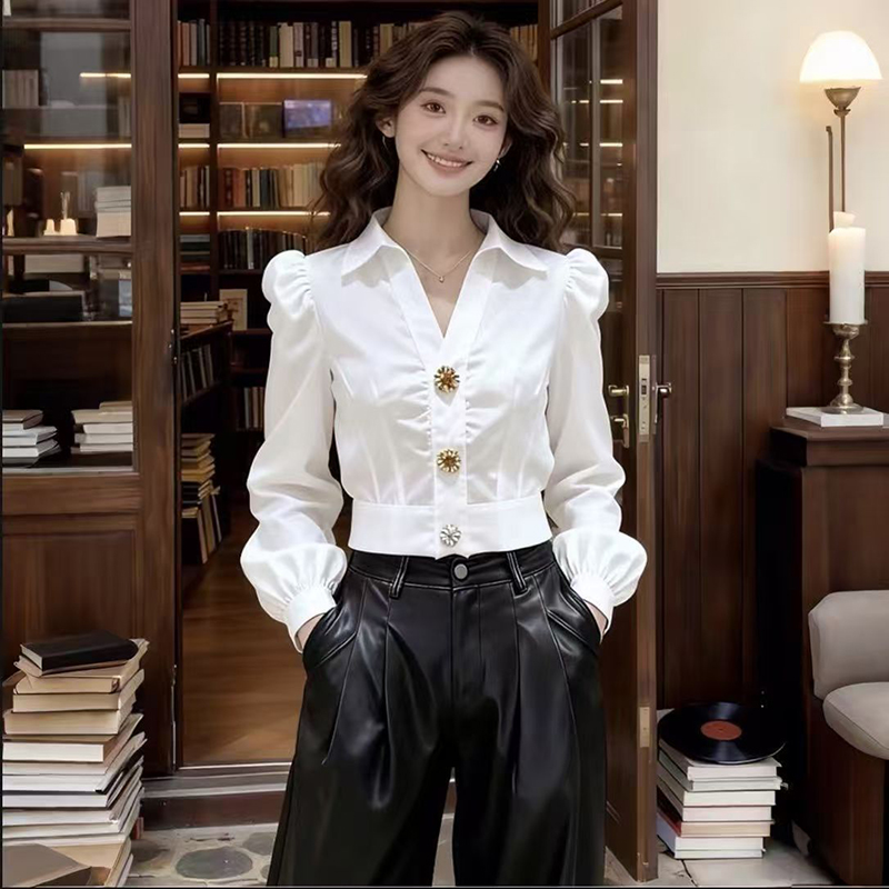 YF7210-图片色高级感泡泡袖翻领个性纽扣拼接修腰短装白色法式气质上衣