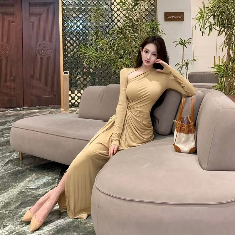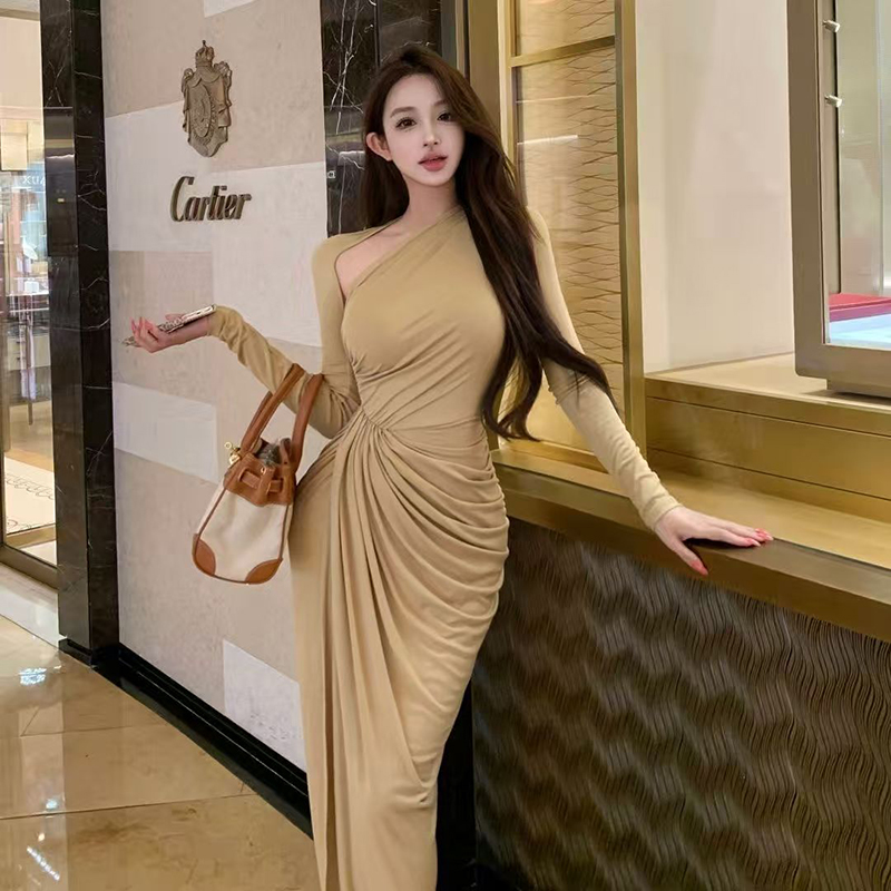 YF7211-(2色入内)名媛气质褶折镂空套头扭纹收腰交叉性感弹力包臀显瘦礼服裙子