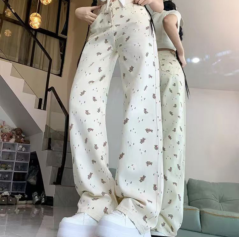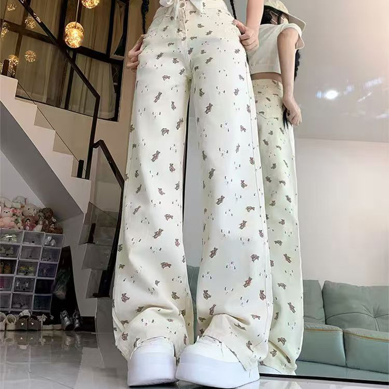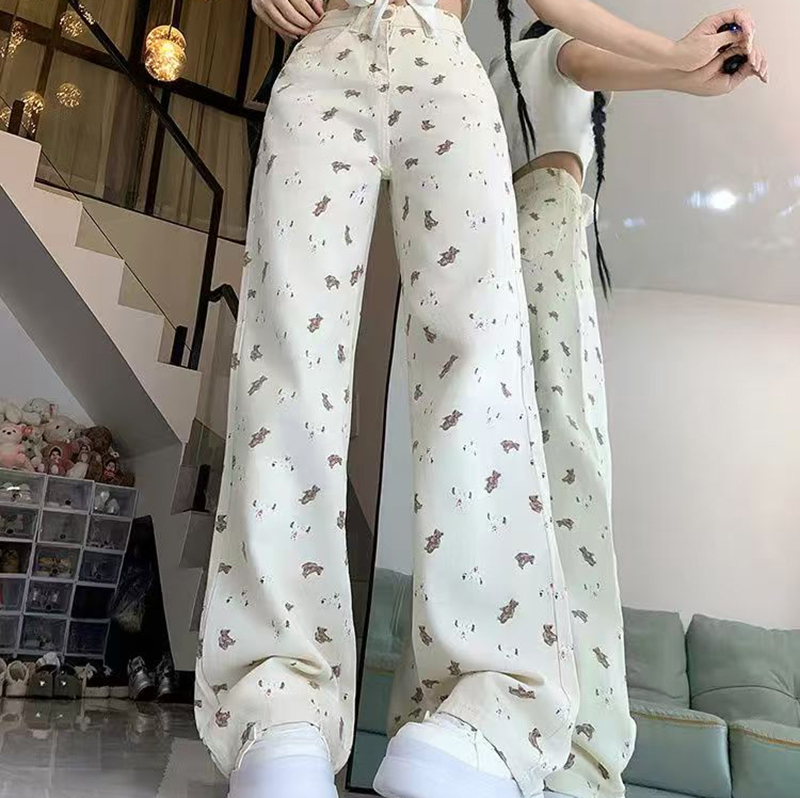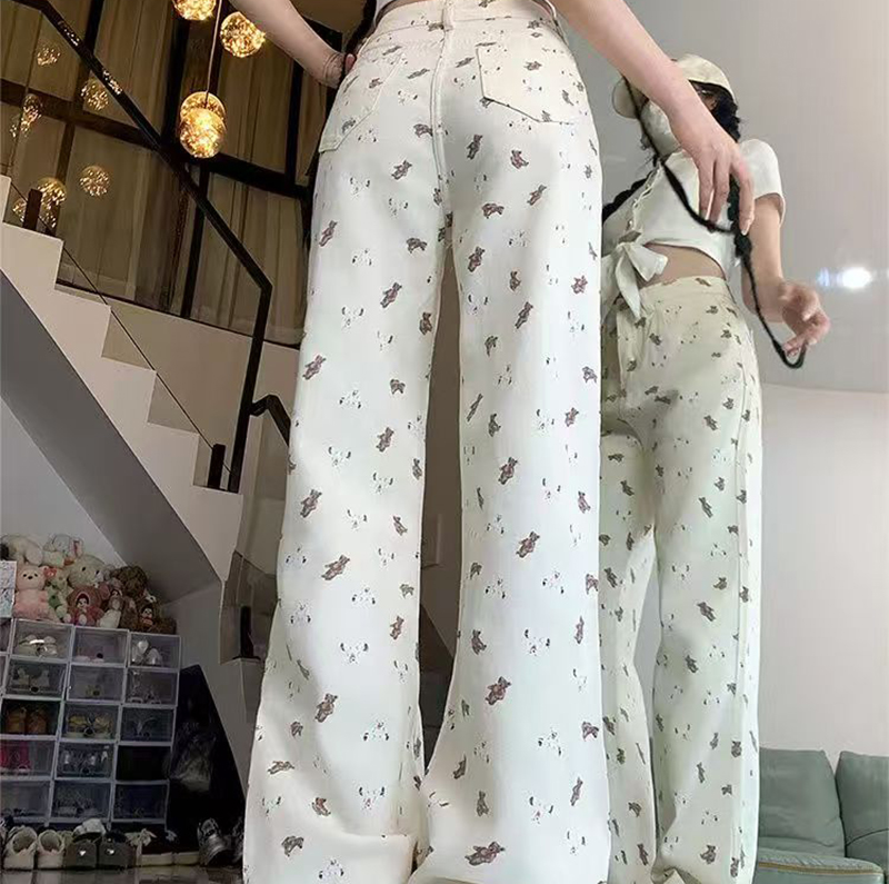 YF7216-图片色超便宜时尚小熊印花高腰直筒坠地感白色时尚牛仔裤