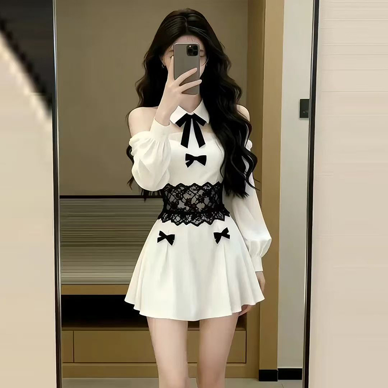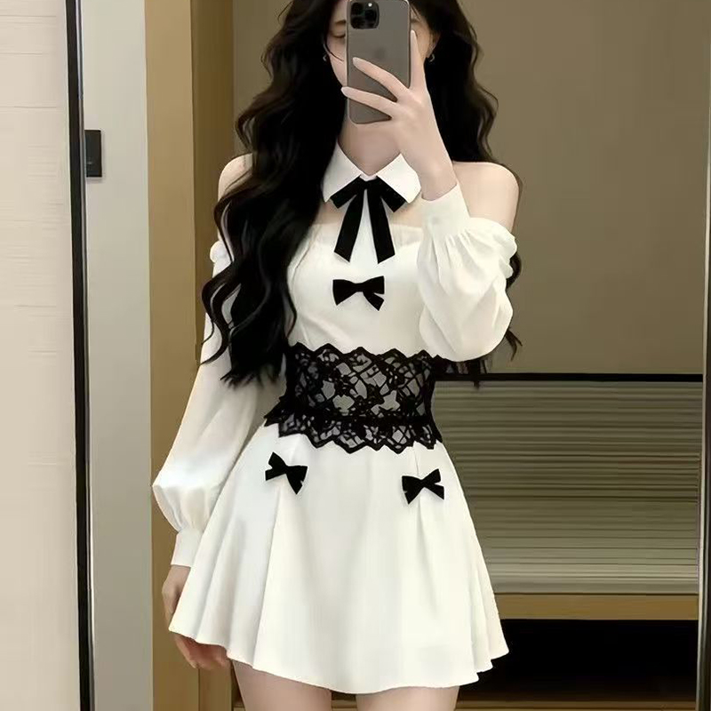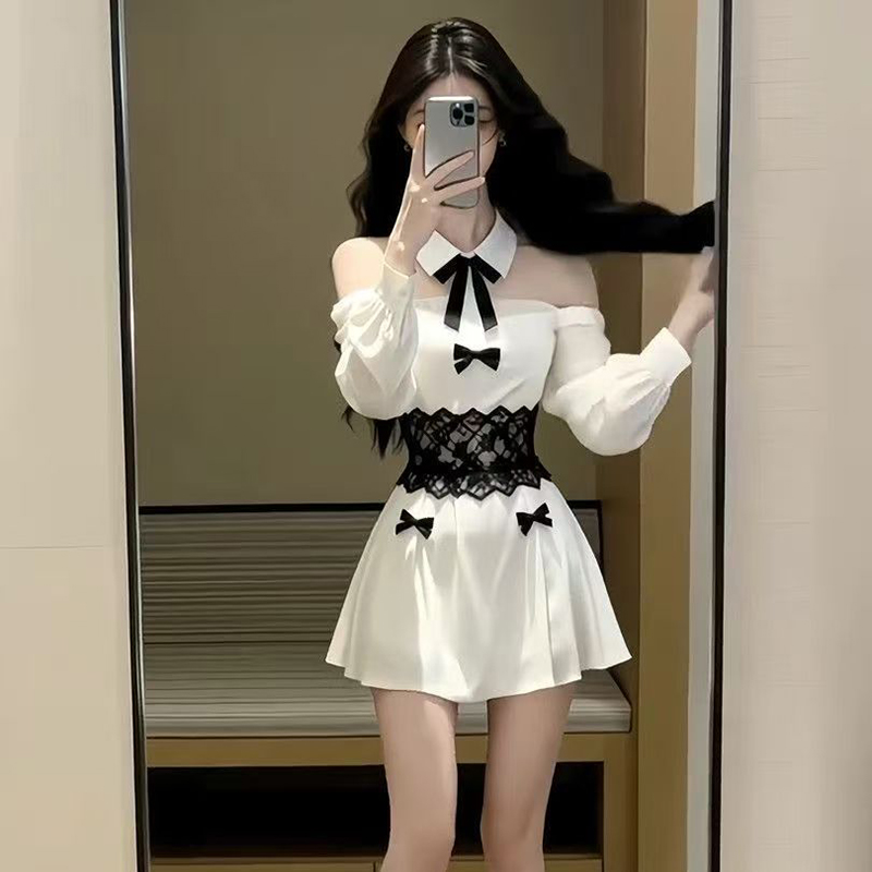 YF7220-图片色名媛气质镂空长袖翻领系蝴蝶结蕾丝修腰显瘦褶折新款连衣裙