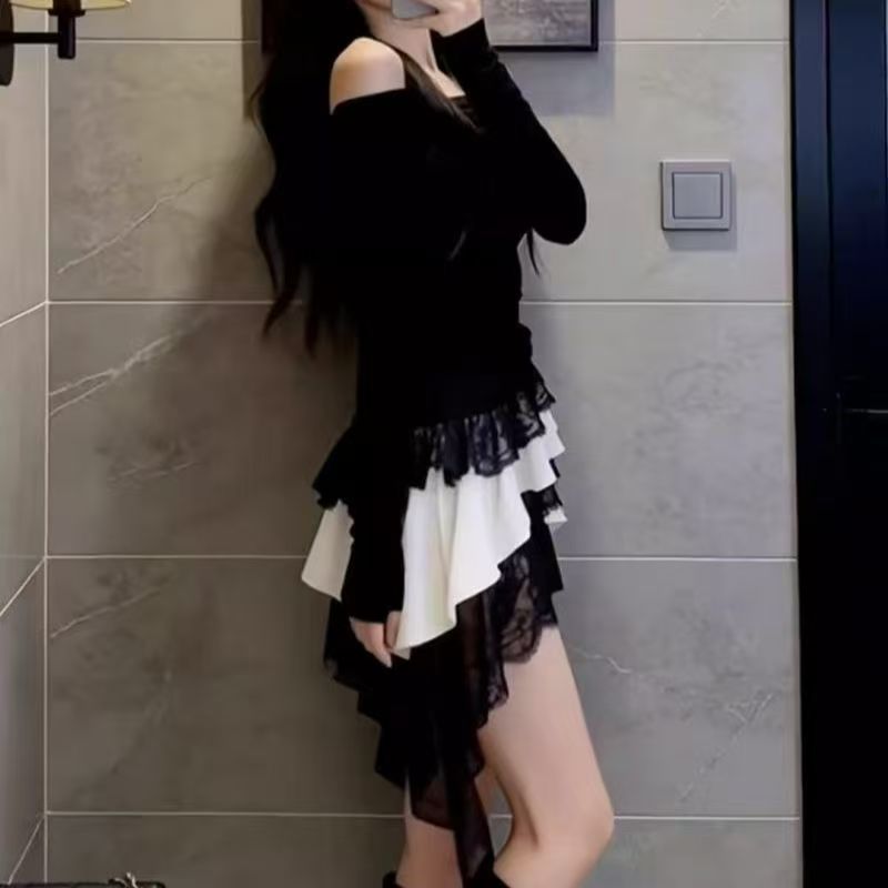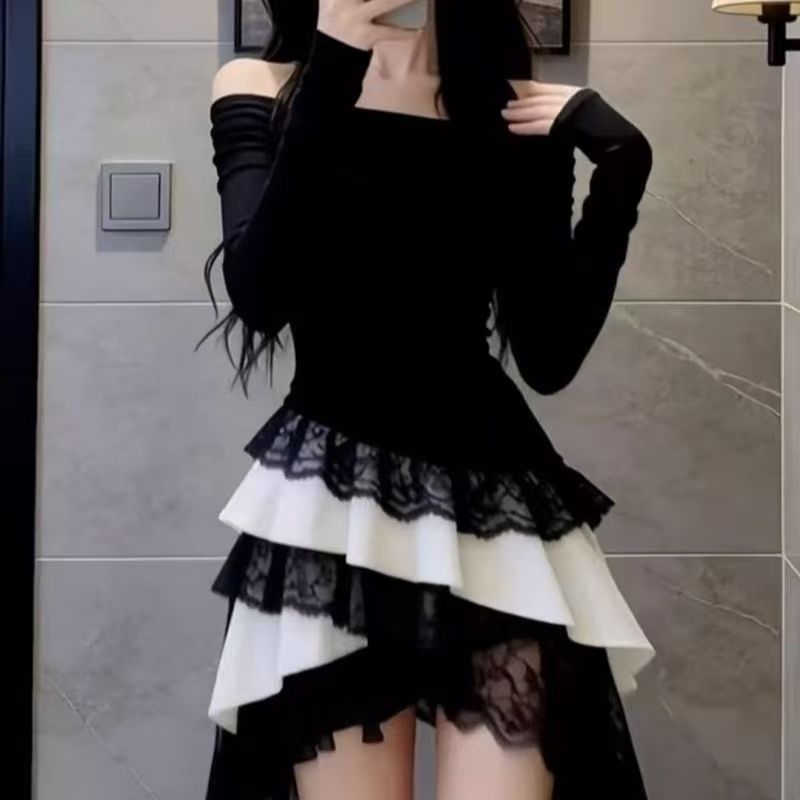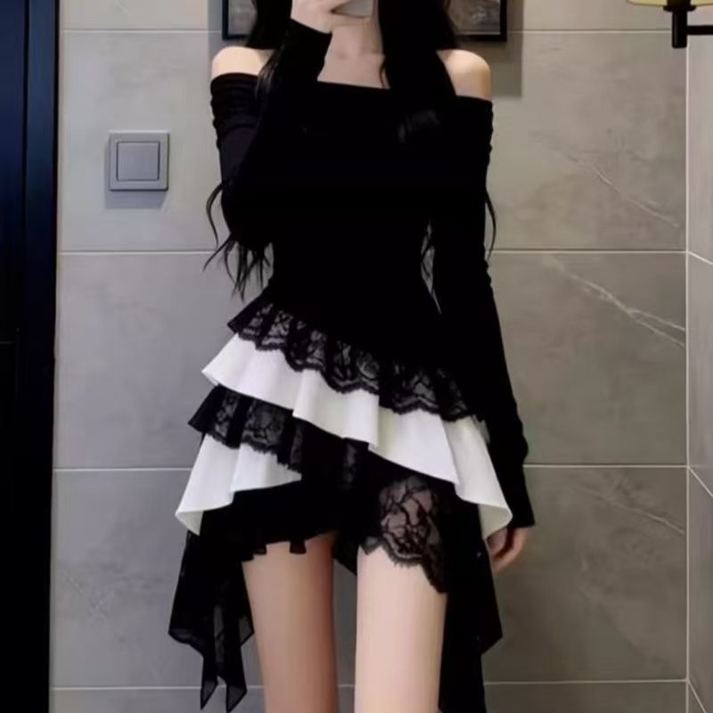 YF7221-图片色赫本风一字肩长袖蕾丝撞色设计波浪不规则甜美法式连衣裙