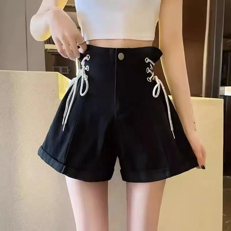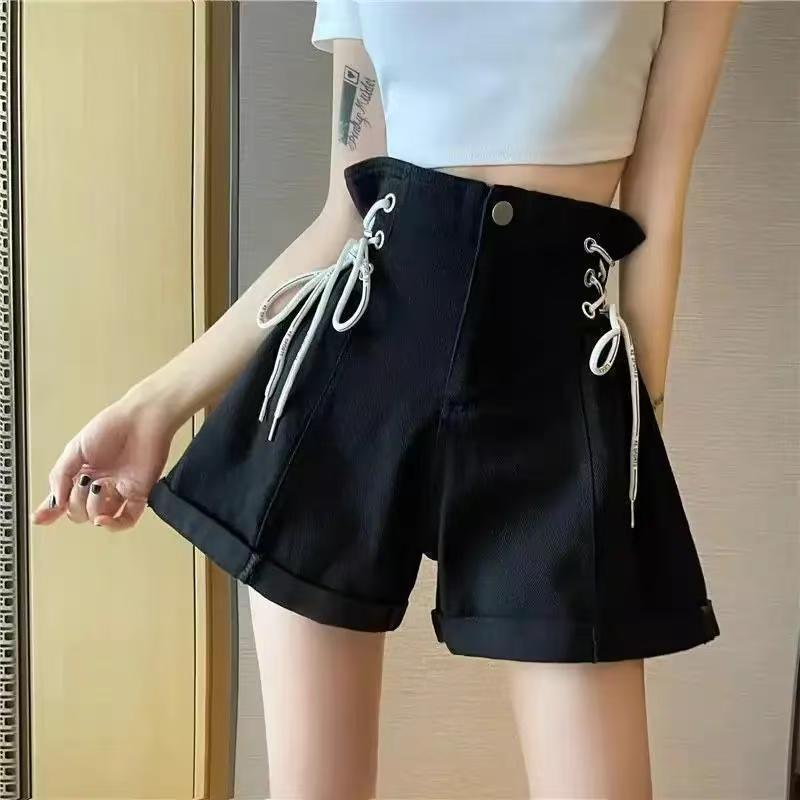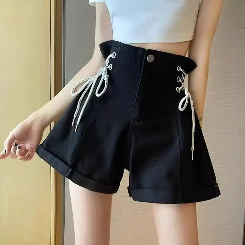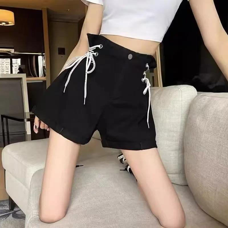 YF7224-图片色港式夏季新款穿洞绑绳系搞高腰设计小众别致感牛仔短裤