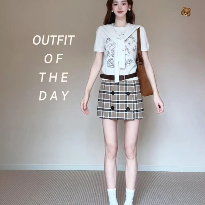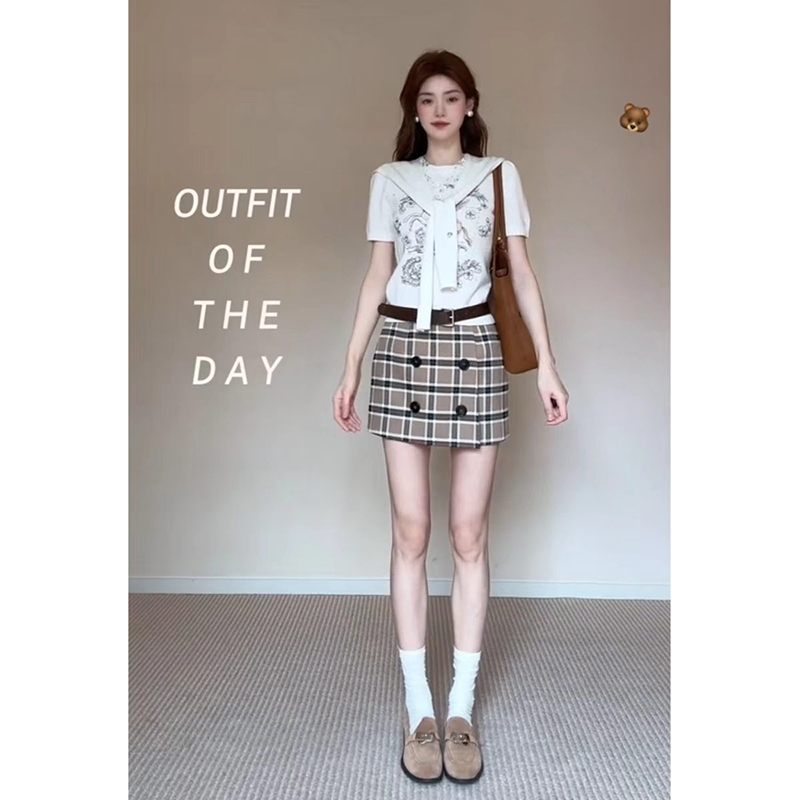 YF7227-图片色韩版时尚高腰双排扣英伦风格子包臀显瘦西装短裙